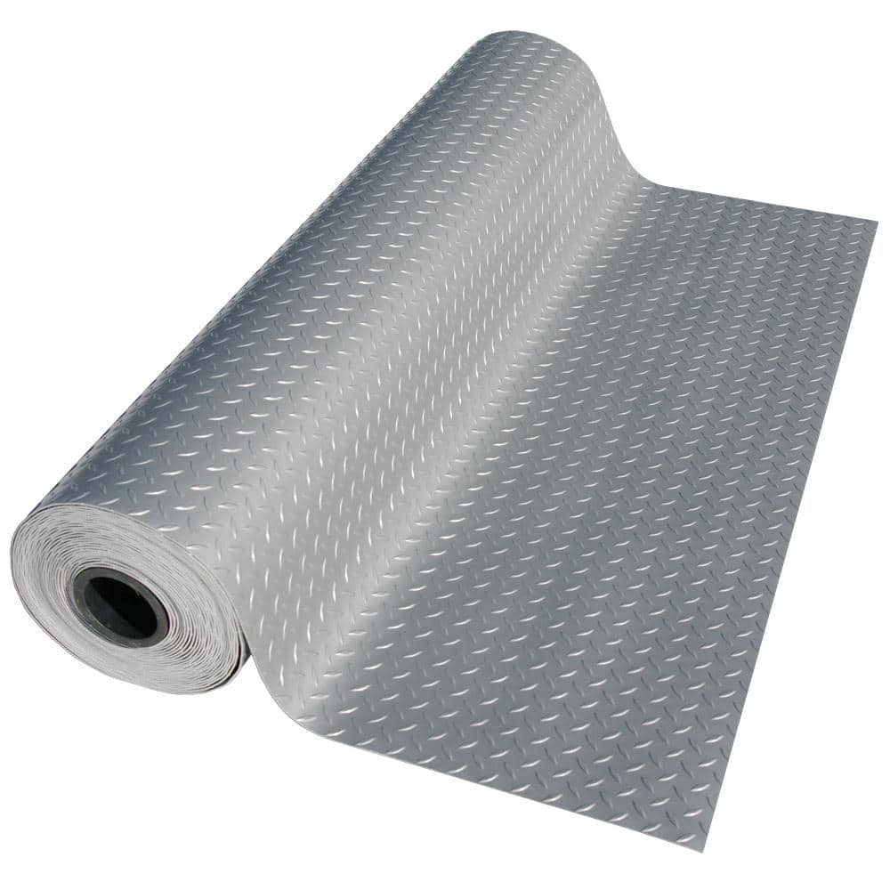 Durable PVC flooring with an industrial diamond-plate texture delivers slip-resistant protection for garages, gyms, and utility spaces. Lightweight and easy to install with loose-lay or tape, this 4 ft. x 6 ft. roll covers 24 sq. ft. in a metallic silver finish. Resistant to water, abrasion, salt, and common household chemicals for reliable, long-term use.