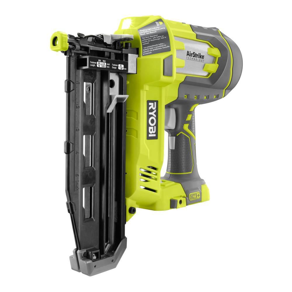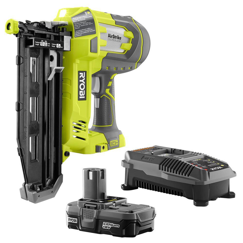 RYOBI introduces the 18-Volt ONE+ AirStrike 16-Gauge Cordless Straight Finish Nailer Kit with ONE+ 2.0 Ah Lithium-Ion Battery and Charger. This 16-Gauge Straight Finish Nailer features AirStrike Technology, which eliminates the need for noisy compressors, bulky hoses, or expensive gas cartridges. This means faster setup and easier maneuvering on the job site. The RYOBI ONE+ AirStrike 16-Gauge Straight Finish Nailer drives 16-Gauge finish nails ranging from 3/4 in. to 2-1/2 in. long. The battery in this kit features lithium-ion battery cells, providing the user with up to 1.5X more runtime compared to Ni-Cd counterparts. The battery is engineered to deliver fade-free power for maximum performance. The 18-Volt ONE+ Dual Chemistry IntelliPort Charger is compatible with all RYOBI ONE+ lithium-ion batteries and features IntelliPort Technology to maximize the lifetime of your RYOBI batteries. Best of all, this kit is part of the RYOBI ONE+ System of over 175 cordless tools that all work on the same battery platform. Backed by the RYOBI 3-Year Manufacturer's Warranty, this nailer includes a belt clip, sample finish nails, a 2.0 Ah Battery, a Dual Chemistry IntelliPort Charger and an operator's manual.