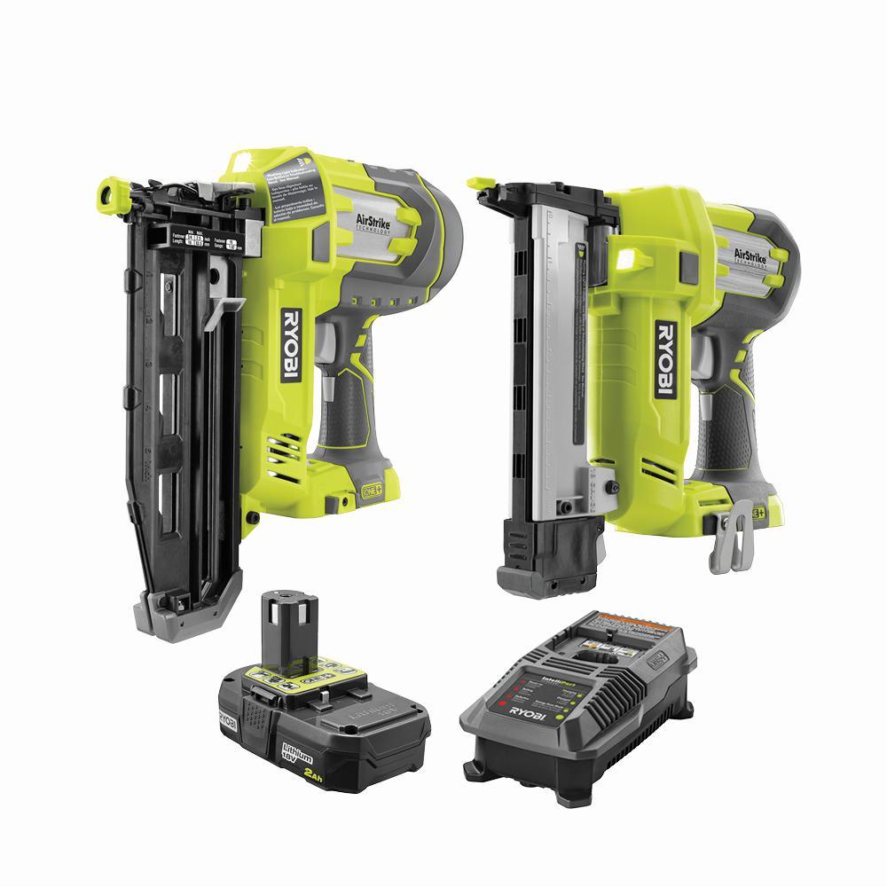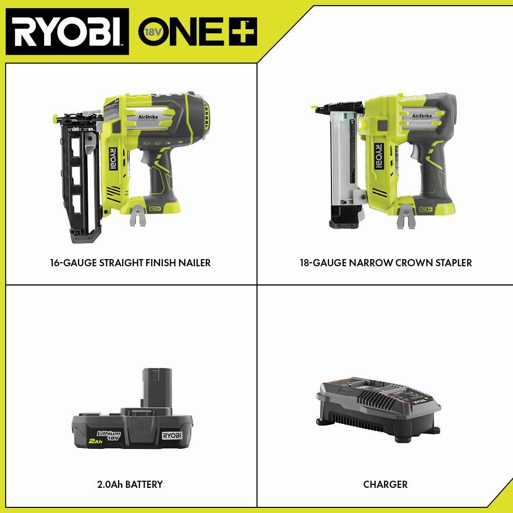RYOBI introduces the 18-Volt ONE+ Airstrike 16-Gauge Straight Finish Nailer and 18-Gauge Narrow Crown Stapler with Lithium-ion Battery and Charger Kit. The AirStrike 16-Gauge Straight Finish Nailer features AirStrike Technology, which eliminates the need for noisy compressors, bulky hoses, or expensive gas cartridges. This means faster setup and easier maneuvering on the job site. The AirStrike Straight Finish Nailer drives 16-Gauge nails from 3/4 in. to 2-1/2 in. l. The 18-Volt ONE+ AirStrike 18-Gauge Cordless Narrow Crown Stapler also features AirStrike Technology, and drives 3/8 in. to 1-1/2 in. narrow crown staples. The battery in this kit features lithium-ion battery cells, providing the user with up to 1.5X more runtime compared to Ni-Cd counterparts. The 18-Volt ONE+ Dual Chemistry IntelliPort Charger is compatible with all RYOBI ONE+ lithium-ion batteries and features IntelliPort Technology to maximize the lifetime of your RYOBI batteries. Best of all, this kit is part of the RYOBI ONE+ System of over 175 cordless tools that all work on the same battery platform. Backed by the RYOBI 3-year manufacturers warranty, this kit includes an AirStrike 16-Gauge Straight Finish Nailer with belt clip and sample nails, the 18-Volt ONE+ AirStrike 18-Gauge Narrow Crown Stapler with belt clip and sample staples, a 2.0 Ah Compact Lithium-ion Battery, a Dual Chemistry IntelliPort Charger, and an operator's manual.