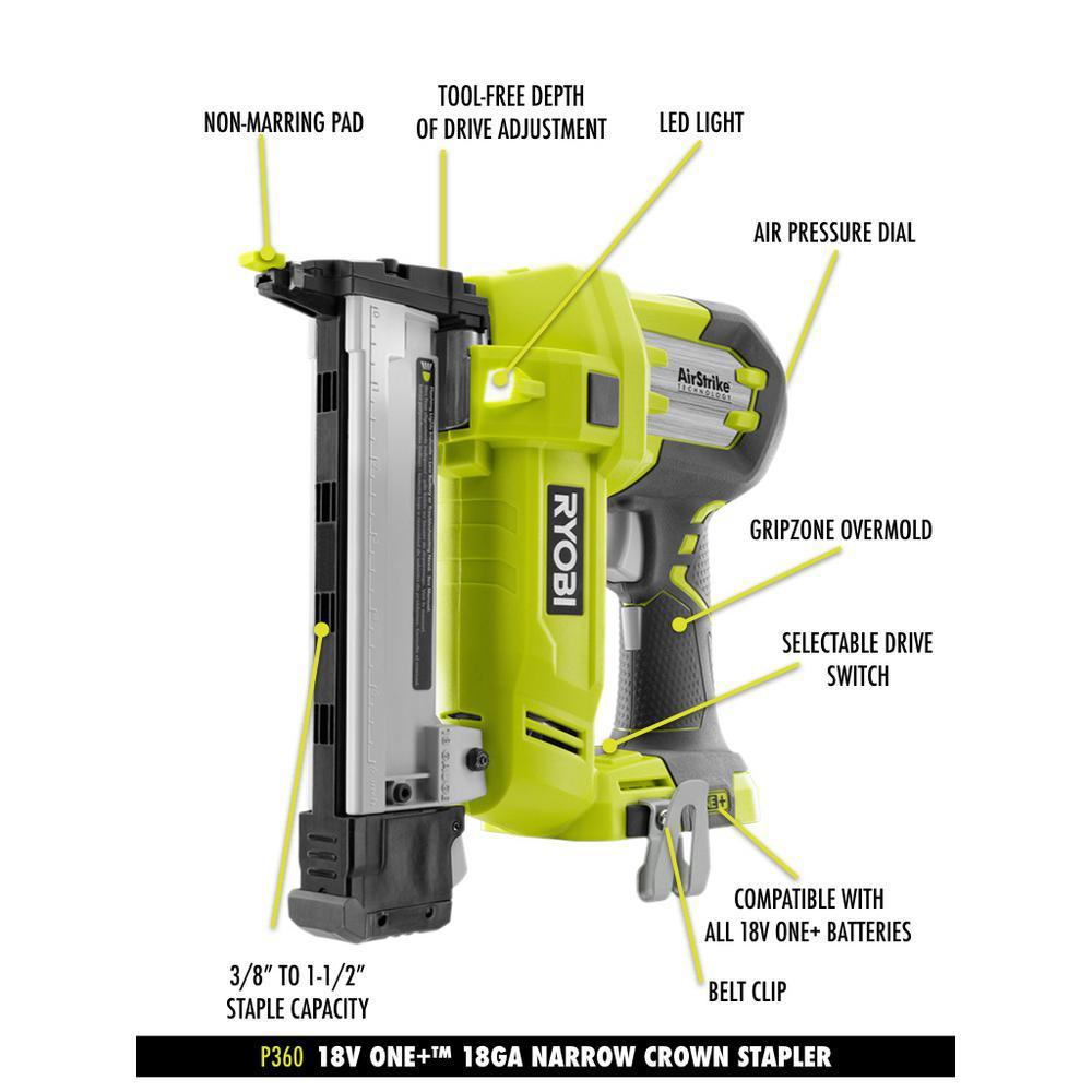 • Includes: (1) P325 18-Volt ONE+ AirStrike 16-Gauge Straight Finish Nailer with belt clip and sample nails, (1) P360 18-Volt ONE+ Lithium-Ion Cordless AirStrike 18-Gauge Cordless Narrow Crown Stapler with belt clip and sample staples, (1) P190 2.0 Ah Compact Lithium-Ion Battery, (1) P118 18-Volt ONE+ Dual Chemistry Charger with IntelliPort Technology, and operator's manuals