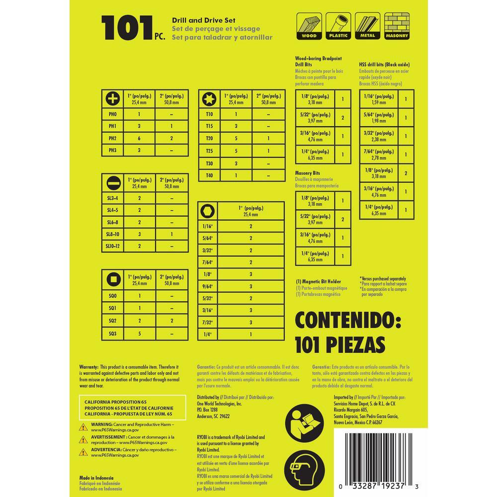 The RYOBI 101-Piece Drill and Drive Set is uniquely designed with a variety of bits to cover a wide range of applications. This set is great for drilling into wood, metal, plastic, and masonry. The Black Oxide Bits included provide a longer life. The 1 in. bits fit perfectly into the Magnetic Bit holder for added control. These go-to staples, accompanied by a variety of brad-point bits, and masonry bits ensure you have the perfect accessory for every project. All bits are conveniently stored in a versatile case.