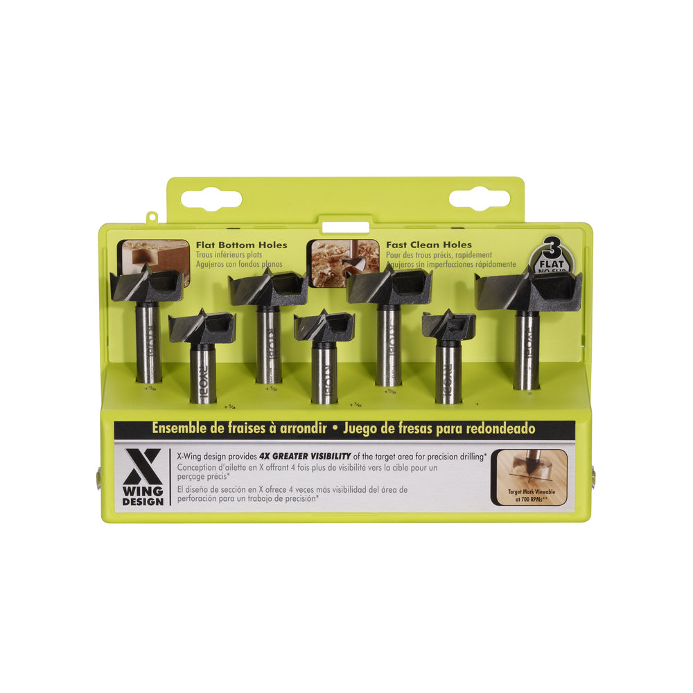 This 7-piece RYOBI Forstner Bit Set delivers flat-bottom, clean holes in wood for precise joinery and hardware installation. The X-Wing design enhances target visibility for accurate drilling and smooth results.