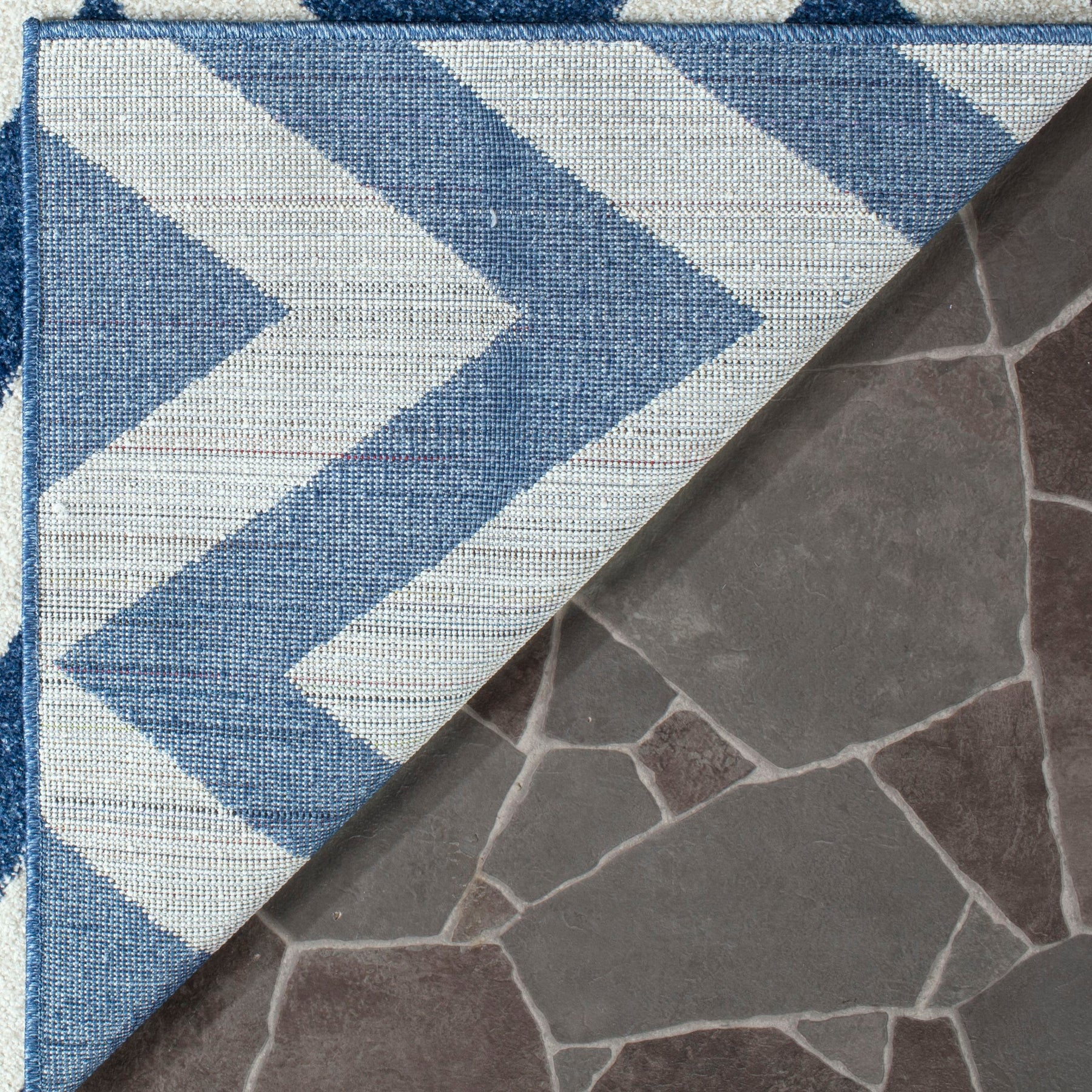 Power-loomed in Turkey, this Safavieh Amherst Bellport round rug features a bold navy and beige chevron pattern that elevates indoor or covered outdoor spaces. The durable polypropylene blend resists heavy foot traffic with a medium 0.39-in pile for comfortable underfoot feel.