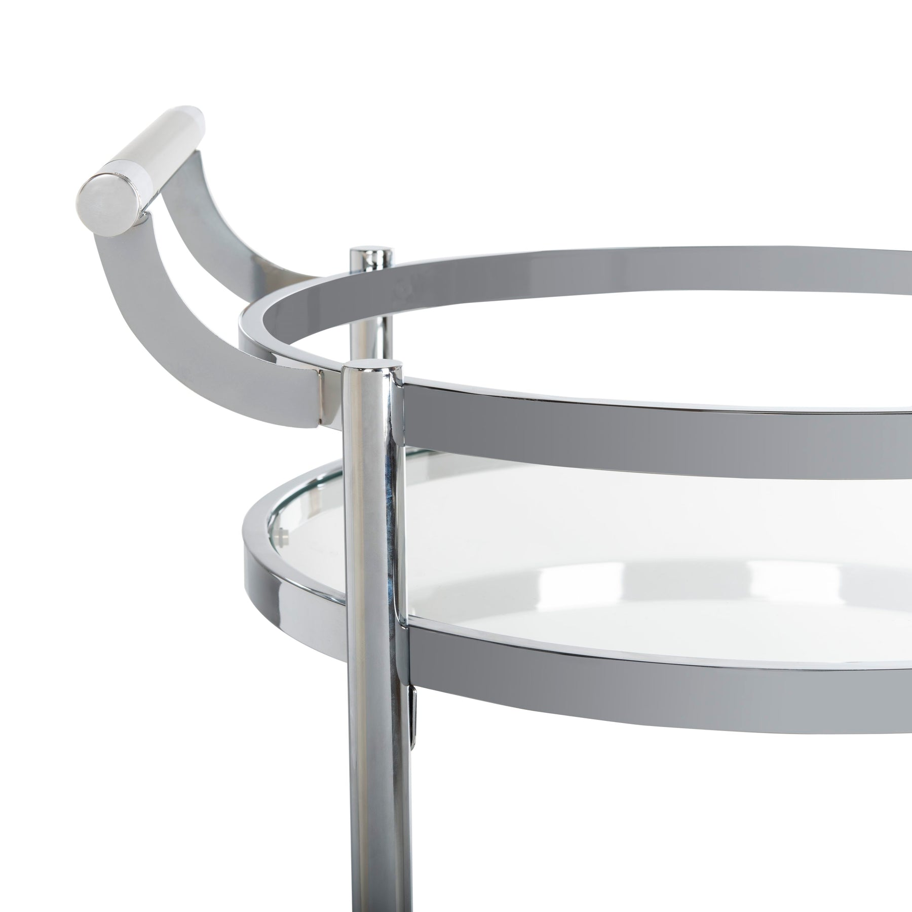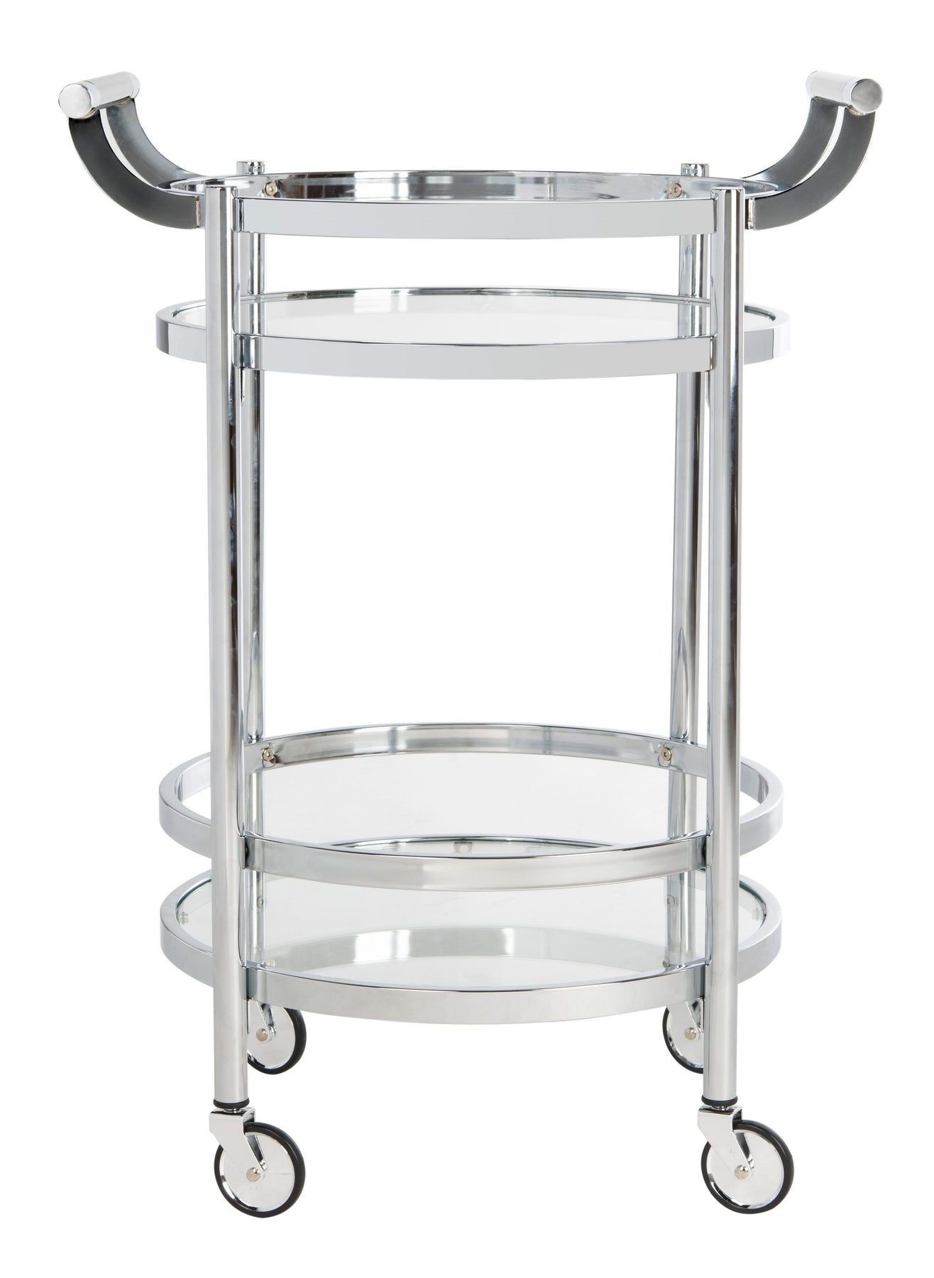 This Safavieh rolling kitchen cart features a gleaming chrome metal frame with two tempered glass shelves for sleek storage and serving. Compact yet functional, its round, 2-tier design and smooth-rolling casters make it perfect for entertaining or adding mobile storage to modern kitchens.