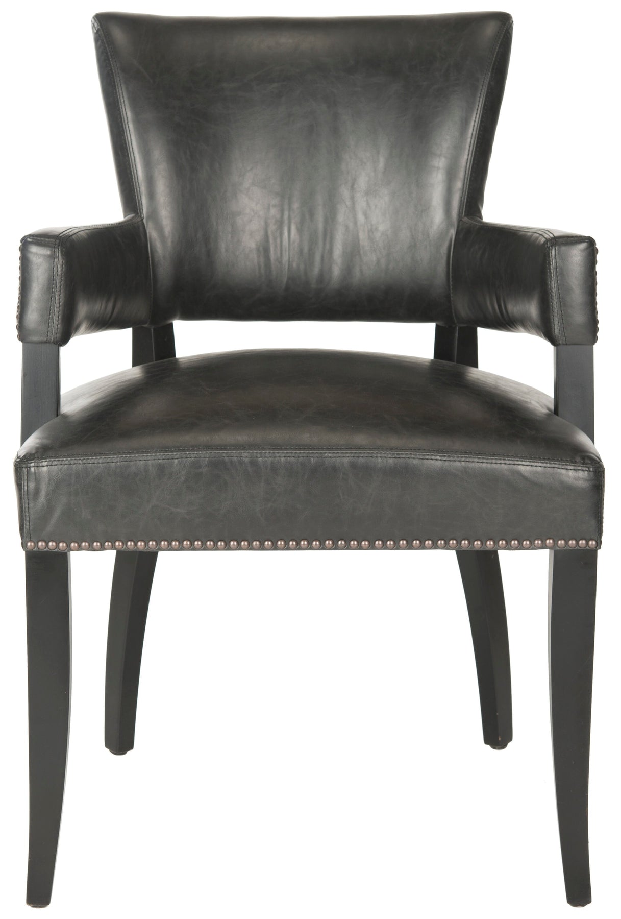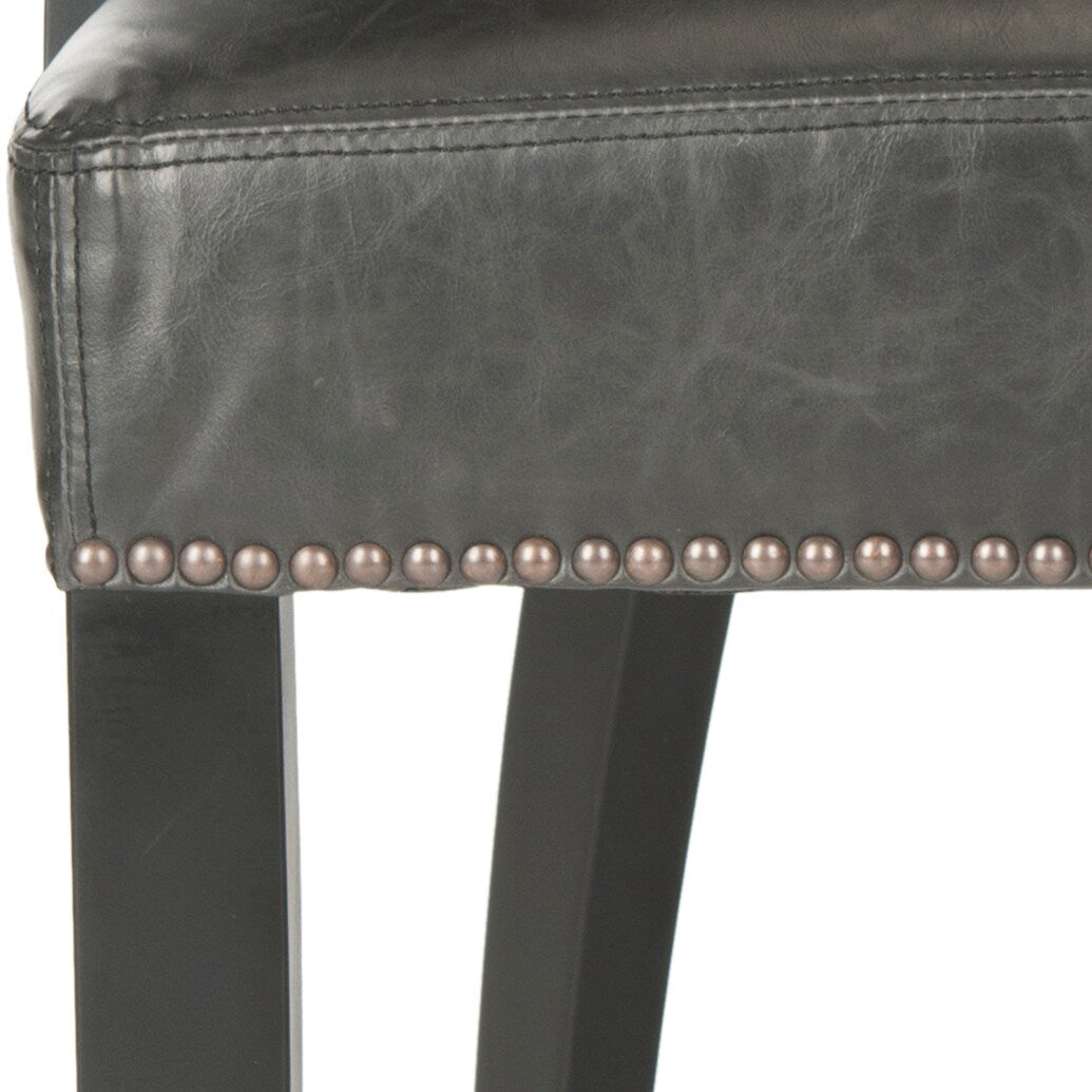 The Safavieh Desa side chair delivers a sophisticated, contemporary silhouette with antique brown PU leather upholstery and brass nailhead trim. Built on a sturdy birch wood frame, it offers supportive seating without assembly required. Ideal for dining or accent seating in modern and transitional spaces.