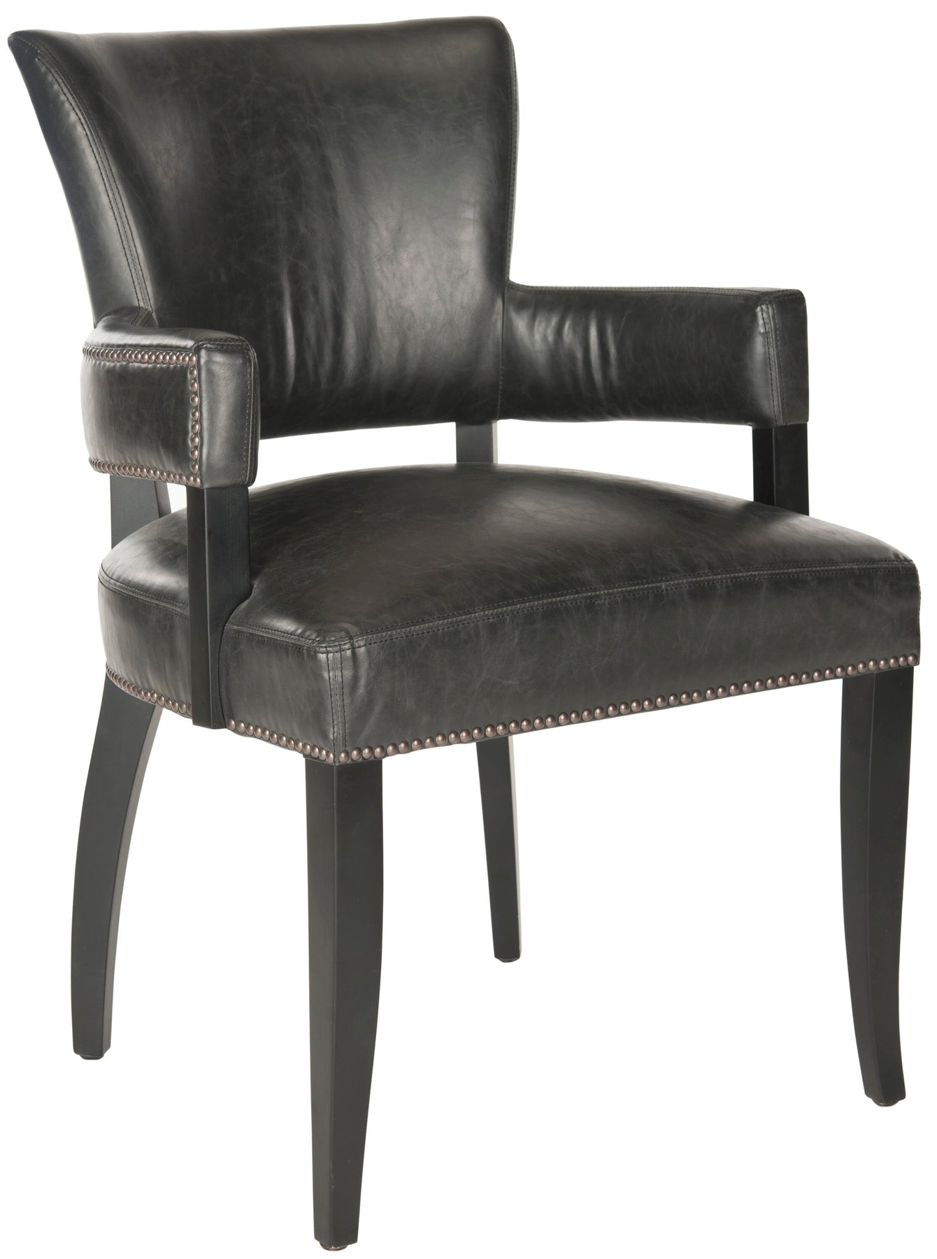 Desa’s supple faux leather and tailored nailhead trim bring a polished, cocktail‑hour elegance to any room. The open arms and curved back feel airy yet enveloping, a chic counterpoint to its sculpted black birch legs. Style it beside a bar cart or pair as dining captains to elevate everyday meals. It’s a modern essential that whispers luxury without trying too hard.