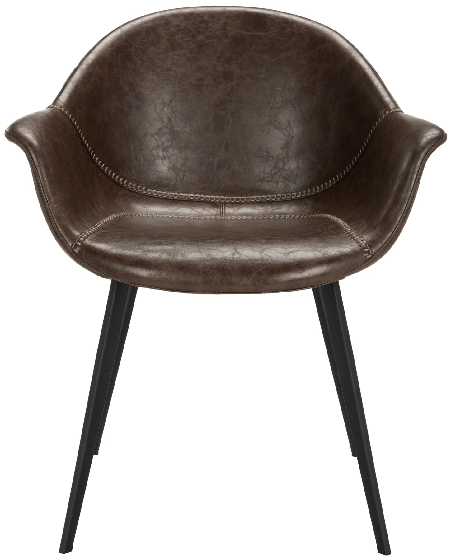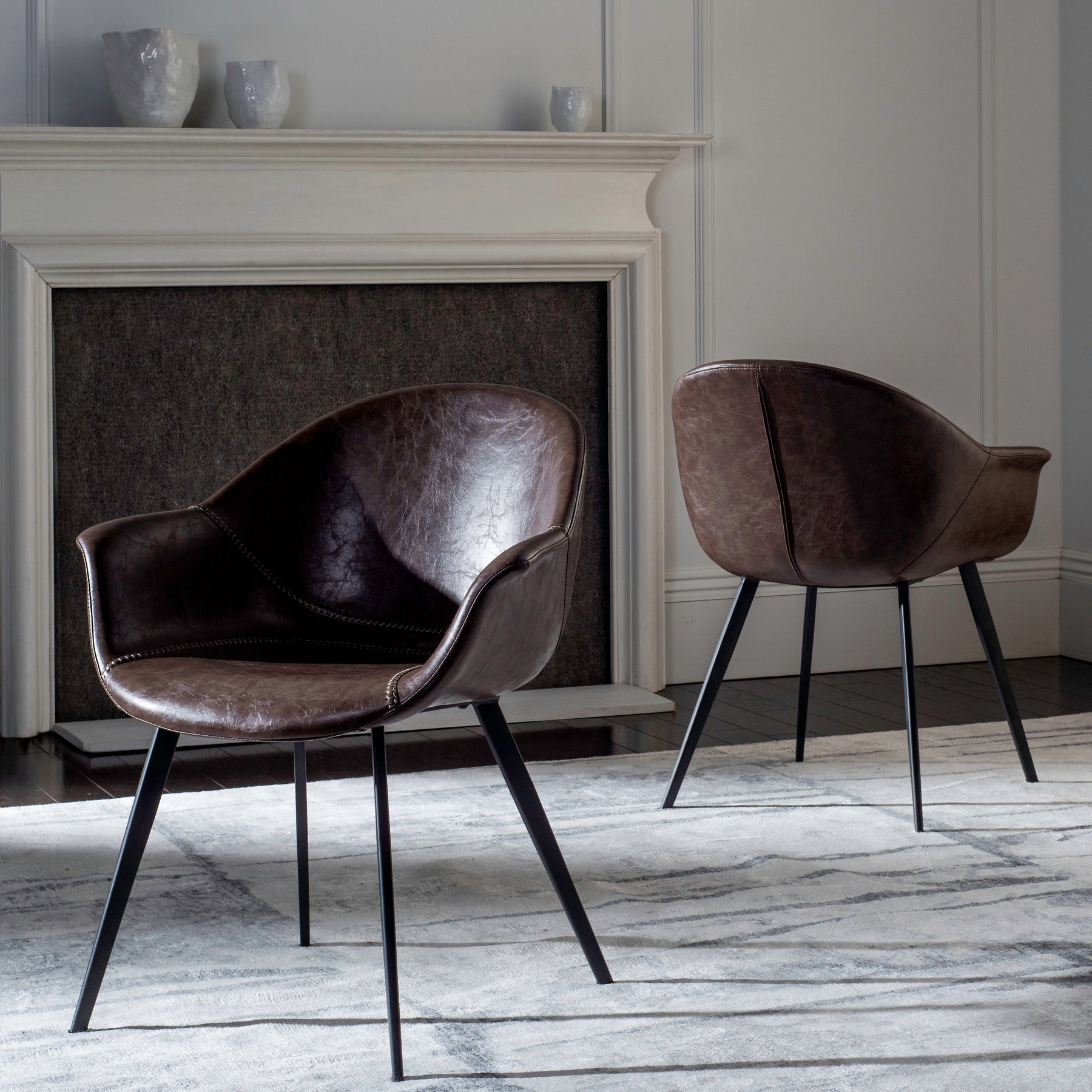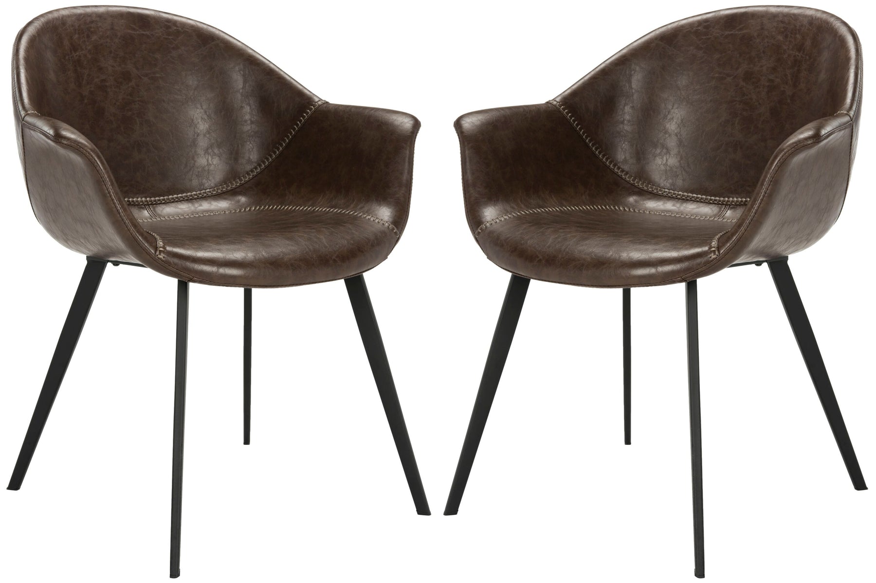 This set of two Dublin arm chairs by Safavieh pairs rich dark-brown faux leather with a sturdy wood/metal frame for modern comfort. Tub-style seats with foam fill and sleek black tapered legs make them ideal for dining rooms, home offices, or living spaces.