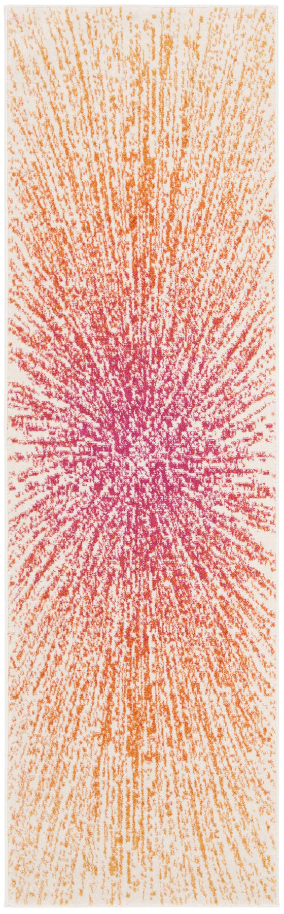 A vibrant indoor runner from Safavieh’s Evoke collection, power loomed for durability and a plush feel. The abstract burst pattern in fuchsia and cream adds a bohemian flair, ideal for hallways and entryways.