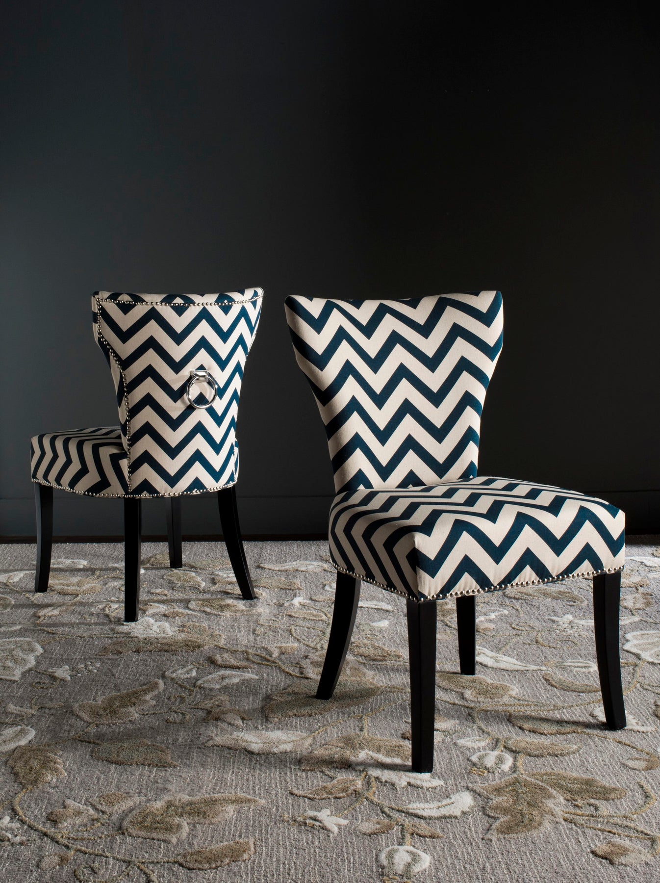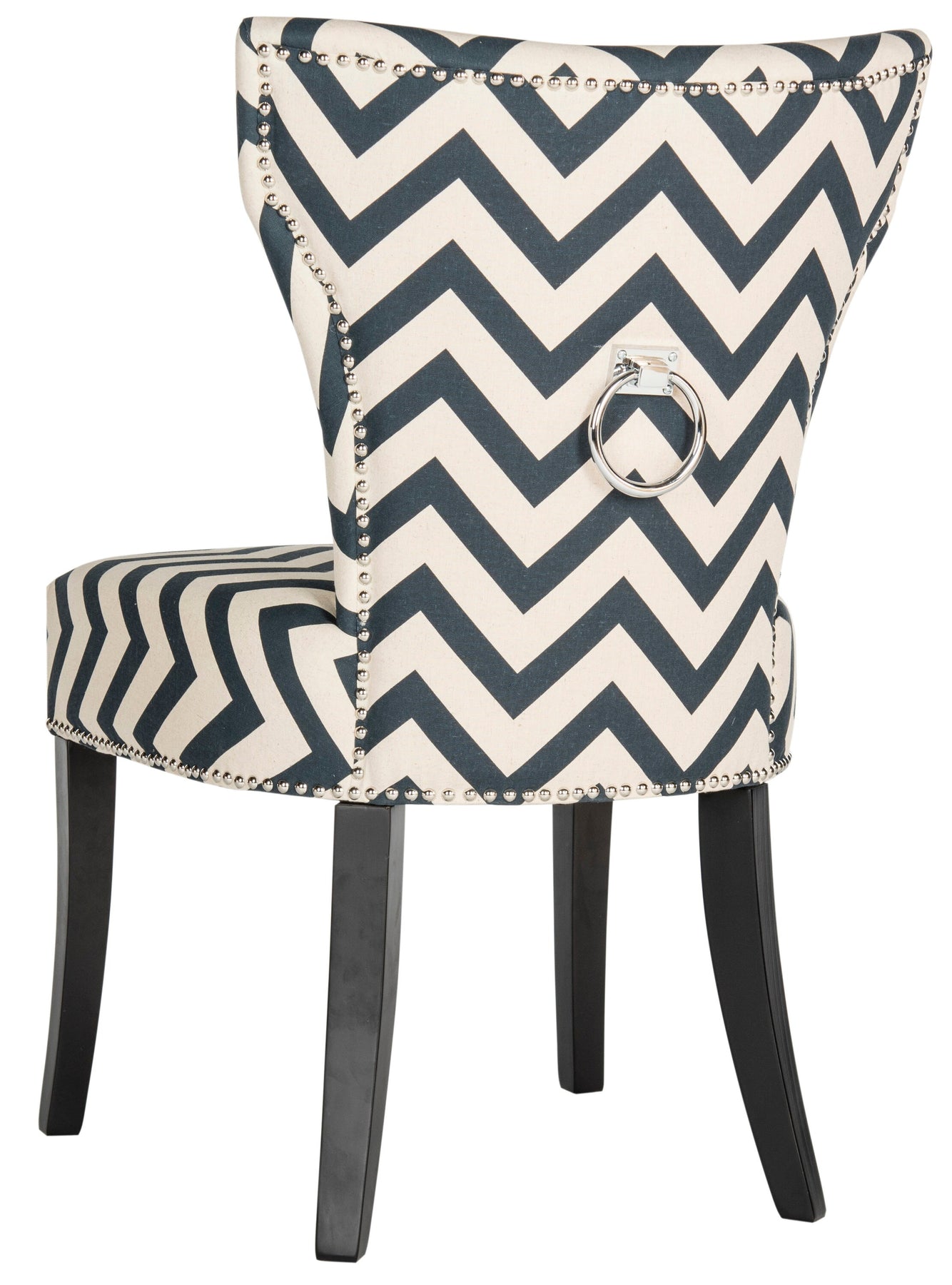 A chic pair of dining side chairs featuring a curvaceous silhouette, navy/white chevron cotton-linen upholstery, and a sturdy wood frame. Silver nailhead trim and a back ring pull add glamorous detail, while plush CA foam/poly fiber cushioning provides comfortable seating.