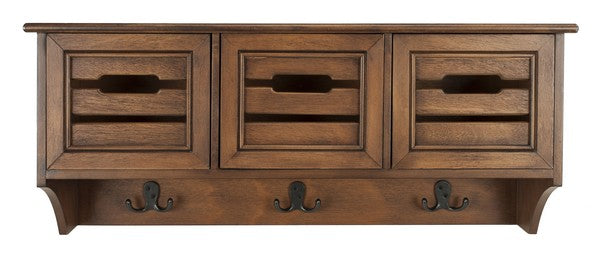 Save space and add organization with this Safavieh wall-mounted rack featuring three drawers and double hooks. Crafted from pinewood and MDF with a water-based painted finish, it’s ideal for entryways, kitchens, or mudrooms.