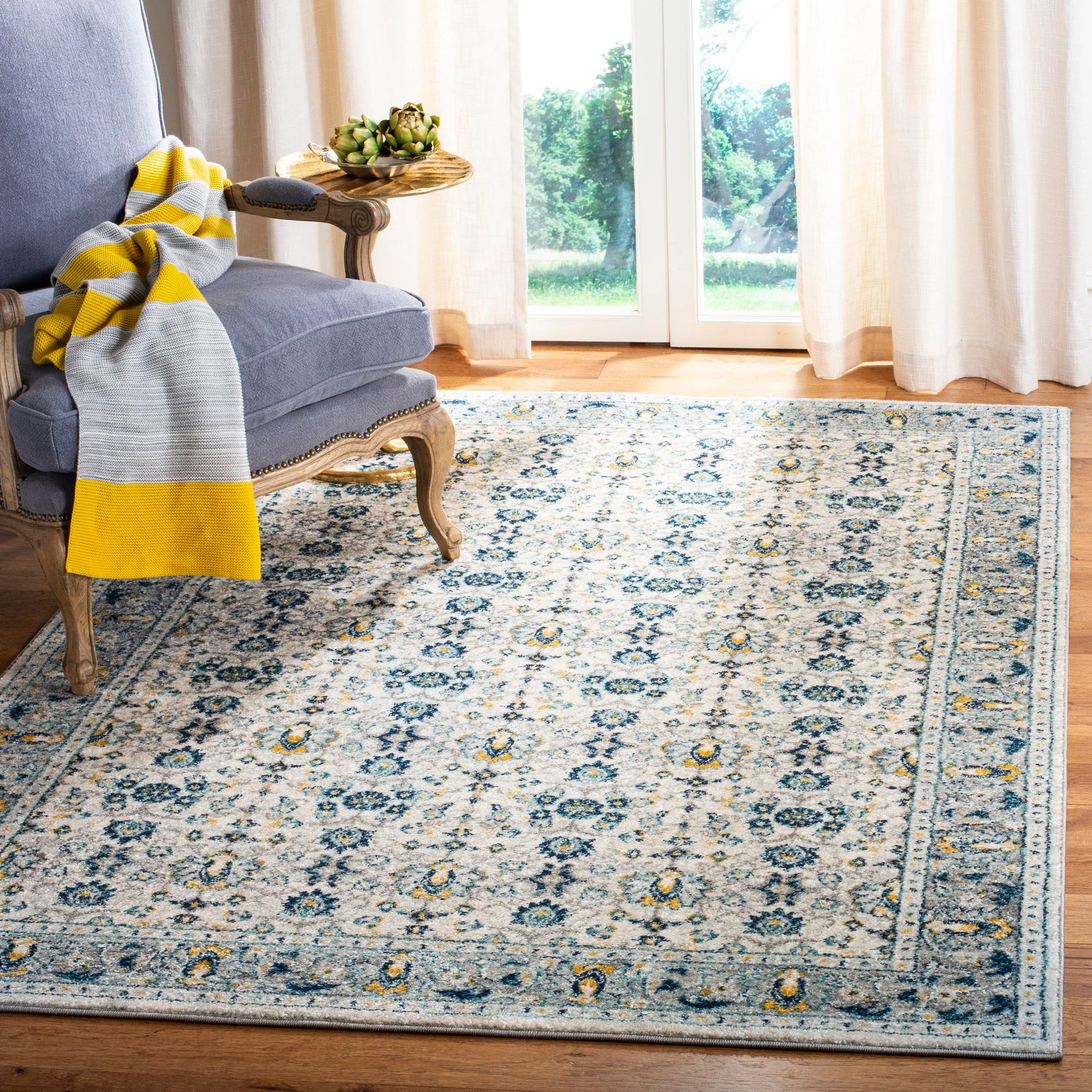 A classic oriental-inspired area rug from Safavieh’s Madison collection, power-loomed in soft, durable polypropylene. The ivory and navy palette with botanical motifs adds timeless style while offering easy-care performance for busy interiors.