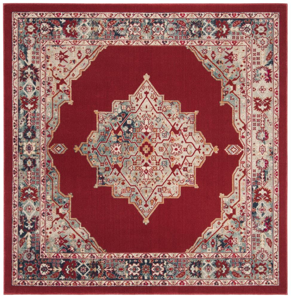 A vibrant square area rug from Safavieh’s Merlot Mitra collection, power-loomed for consistent texture and durability. The red/aqua floral-botanical pattern adds classic charm to living rooms, dining spaces, and bedrooms.
