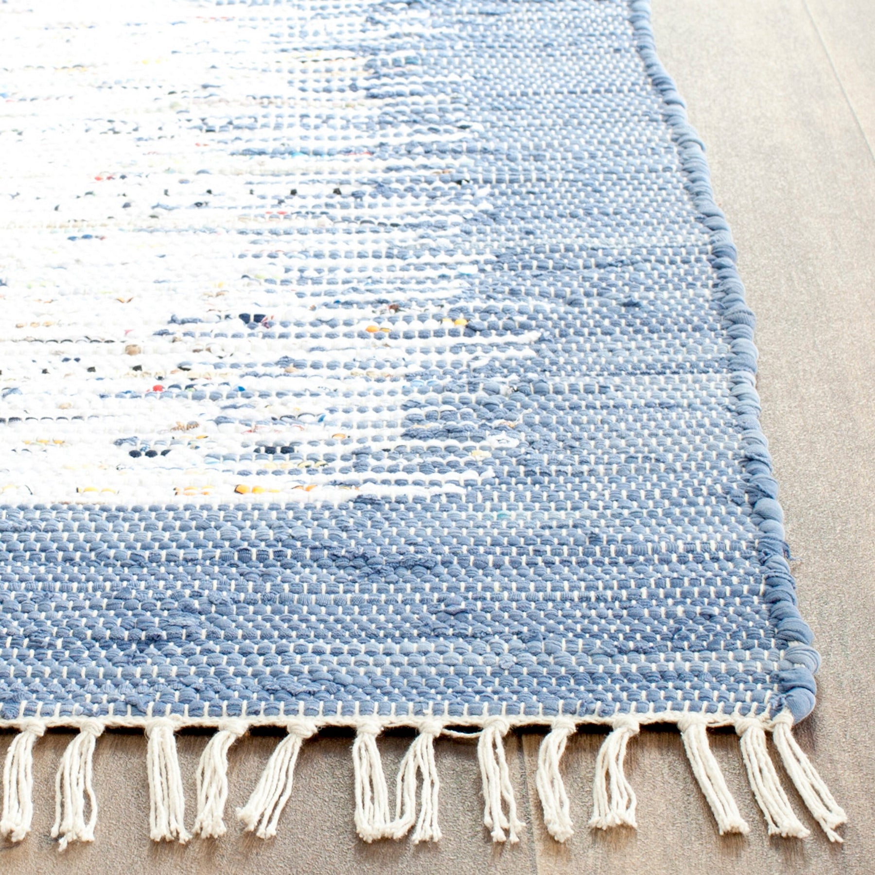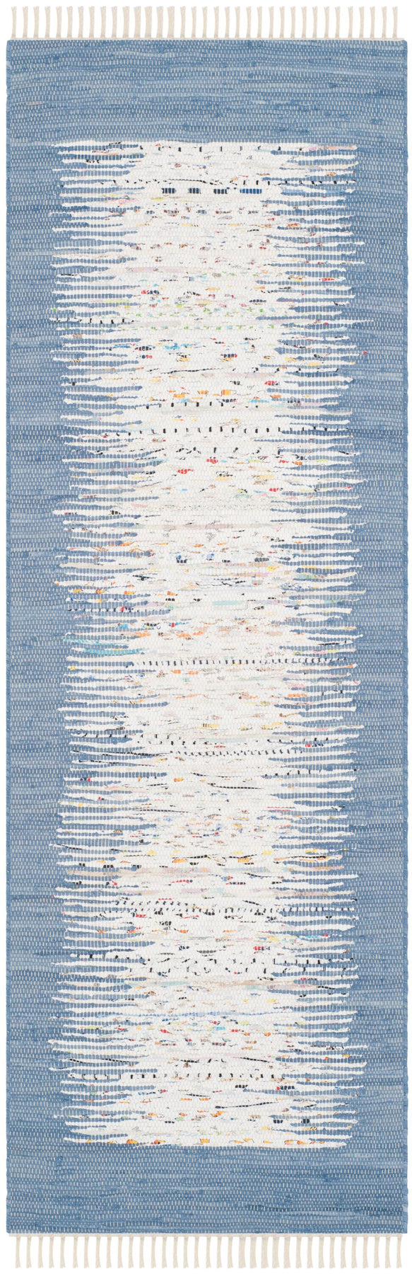 This runner channels seaside ease with its misty ivory center washed by a dark blue border, handwoven in supple cotton for a tactile, artisanal feel. The flatweave keeps the profile sleek while the fringed edges add a flirtatious finish. Float it down a hallway beside whitewashed woods or layer over a larger jute to build dimension. A chic essential that brings relaxed luxury to everyday passages.