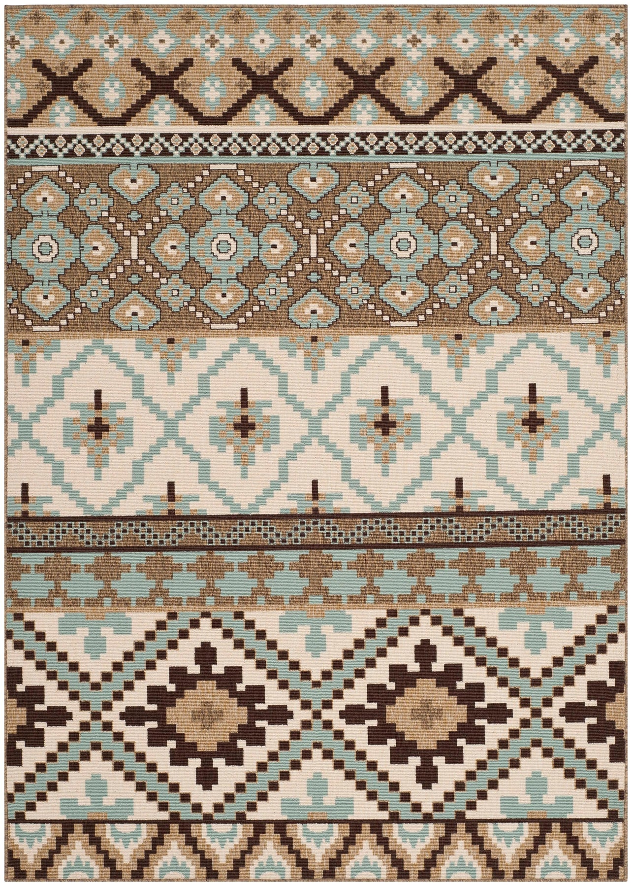 Power-loomed for durability, this Veranda rug blends coastal-inspired abstract patterns with easy-care synthetic fibers. Designed for indoor or outdoor spaces, it resists weather and everyday wear while adding warm creme and brown tones to patios, living rooms, and dining areas.