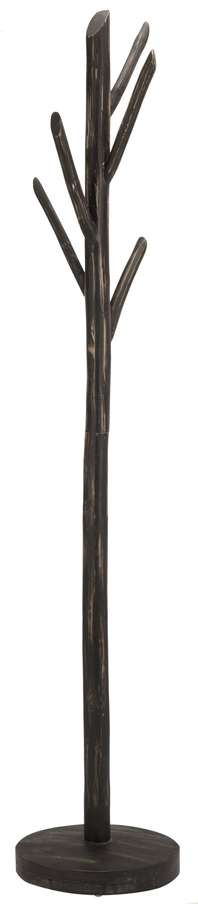 A contemporary tree-branch coat and hat rack crafted from teak with a distressed black finish. This freestanding stand offers five hooks and compact footprint for stylish, flexible storage in entryways, halls, or offices.