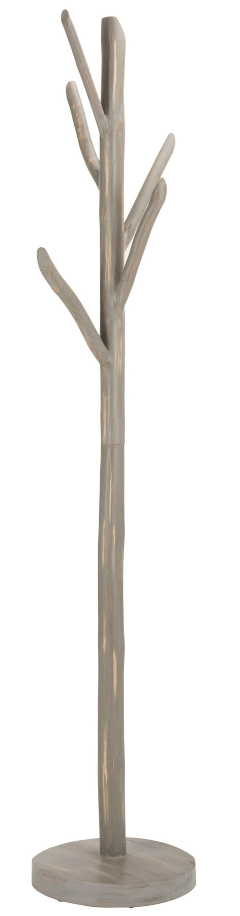 A contemporary tree-branch coat stand crafted from teak with a distressed gray finish. Freestanding and space-savvy, it brings playful style and everyday organization to entryways, halls, or offices.
