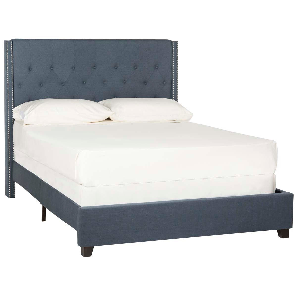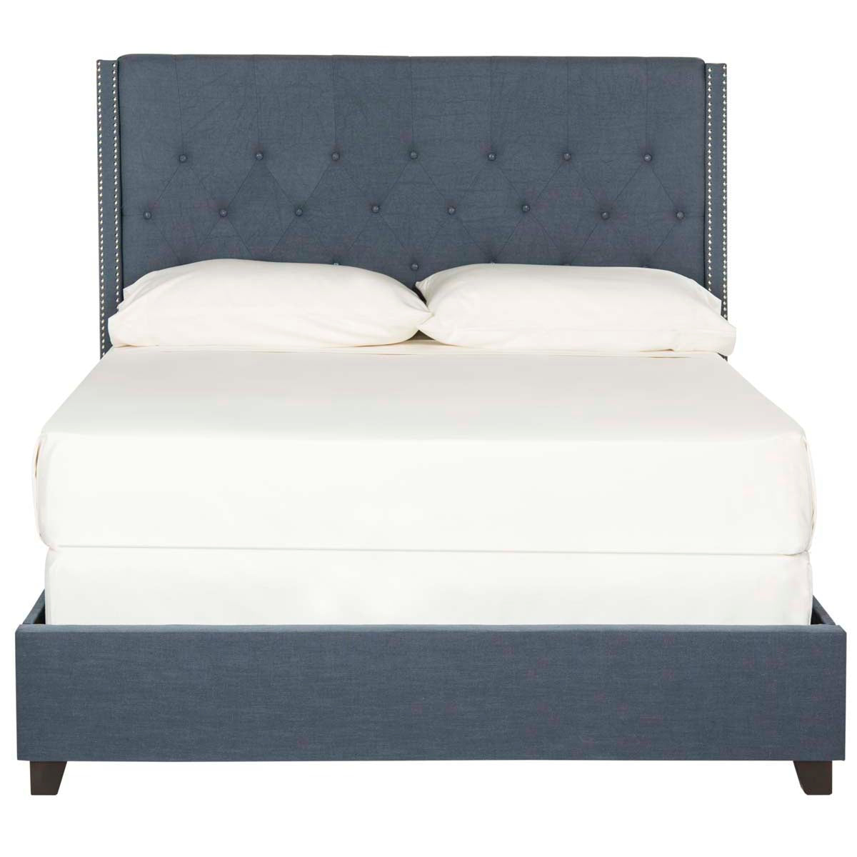 A sophisticated upholstered bed by Safavieh featuring a tall, tufted headboard in rich navy linen with silver nailhead trim. The clean-lined frame and espresso-finished feet bring transitional elegance to any bedroom.