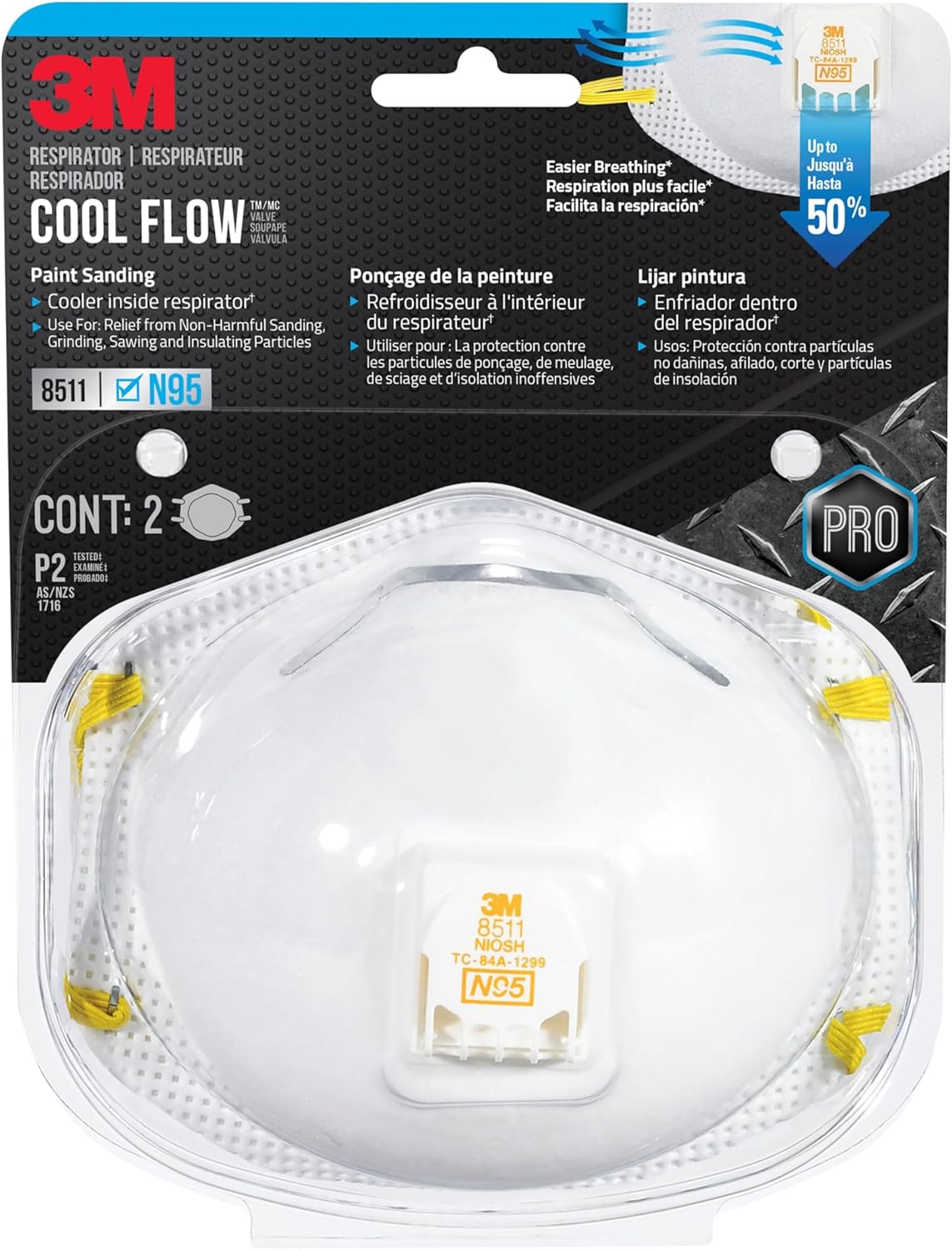3M 8511 N95 Respirator with Cool Flow Valve, Disposable Sanding & Fiberglass Mask, 2-Pack