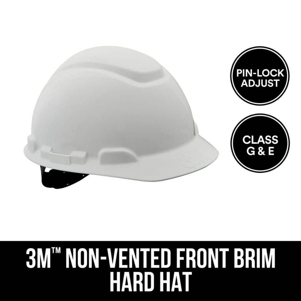 This 3M hard hat delivers lightweight head protection with a durable polyethylene shell and a comfortable pinlock suspension. Non‑vented, Type 1 design meets ANSI Z89.1 Class G & E for electrical protection, with a short brim for upward visibility.