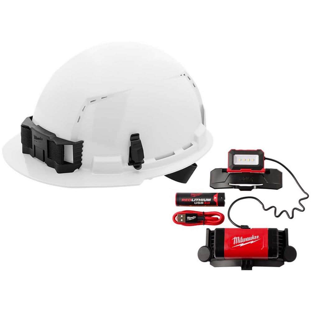 Milwaukee BOLT White Type 1 Class C Front Brim Vented Hard Hat with 4-Point Ratcheting Suspension and 600-Lumen Rechargeable Headlamp