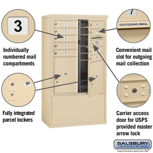 This free-standing 4C horizontal mailbox unit is designed for USPS access and features 9 tenant doors and 2 parcel lockers. Constructed from heavy-duty aluminum with a sandstone finish, it is ideal for indoor or outdoor use.