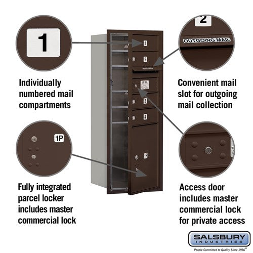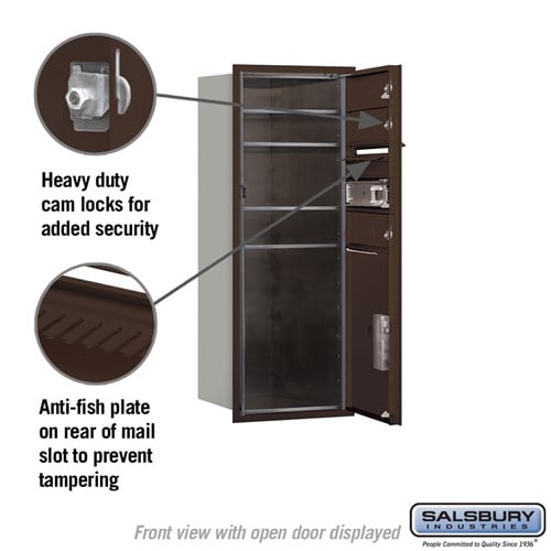 This recessed-mounted 4C horizontal mailbox offers secure private access with 10 doors and an integrated parcel locker. Constructed from heavy-duty aluminum with a durable powder-coated bronze finish, it is ideal for indoor or outdoor use.