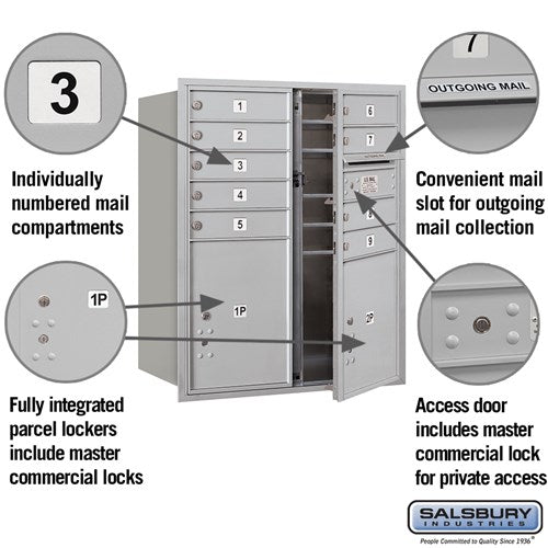 This recessed-mounted 4C horizontal mailbox features 10 doors, including 9 mail compartments and 2 parcel lockers, designed for private access. Constructed from heavy-duty aluminum with a durable powder-coated finish, it offers secure and reliable mail storage for various applications.