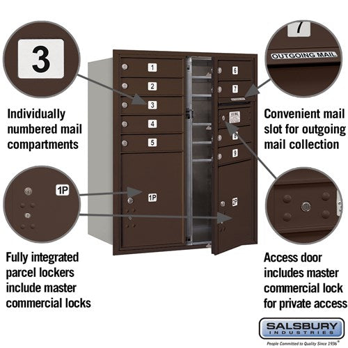 This recessed-mounted mailbox features 10 doors, including parcel lockers, and is designed for private access. Constructed from heavy-duty aluminum with a durable bronze powder-coated finish, it offers secure and stylish mail storage for indoor or outdoor use.