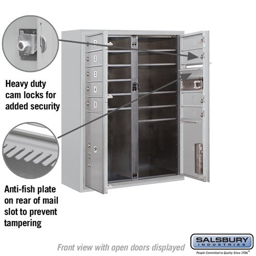 This 10-door surface-mounted mailbox is designed for indoor and outdoor use, featuring heavy-duty aluminum construction and a durable powder-coated finish. It includes two parcel lockers and is USPS-approved for secure mail handling.