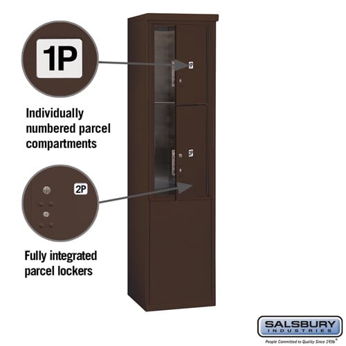 This free-standing parcel locker features 11 doors and 2 parcel lockers, designed for USPS access. Constructed from heavy-duty aluminum with a bronze powder-coated finish, it is ideal for indoor or outdoor use.