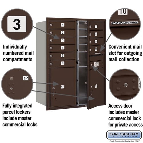 This recessed-mounted mailbox unit features 10 mail compartments and 2 parcel lockers, designed for private access. Constructed from heavy-duty aluminum with a durable bronze powder-coated finish, it offers secure storage and a stylish appearance.