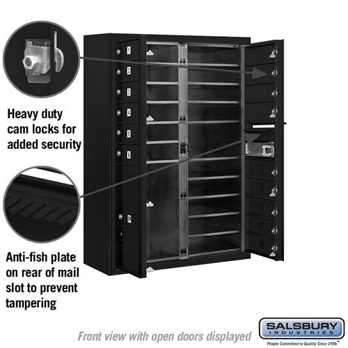 This 11 Door High Surface Mounted Mailbox features 15 numbered compartments and 1 parcel locker, designed for USPS access. Constructed with heavy-duty aluminum and stainless steel hardware, it is suitable for both indoor and outdoor use.