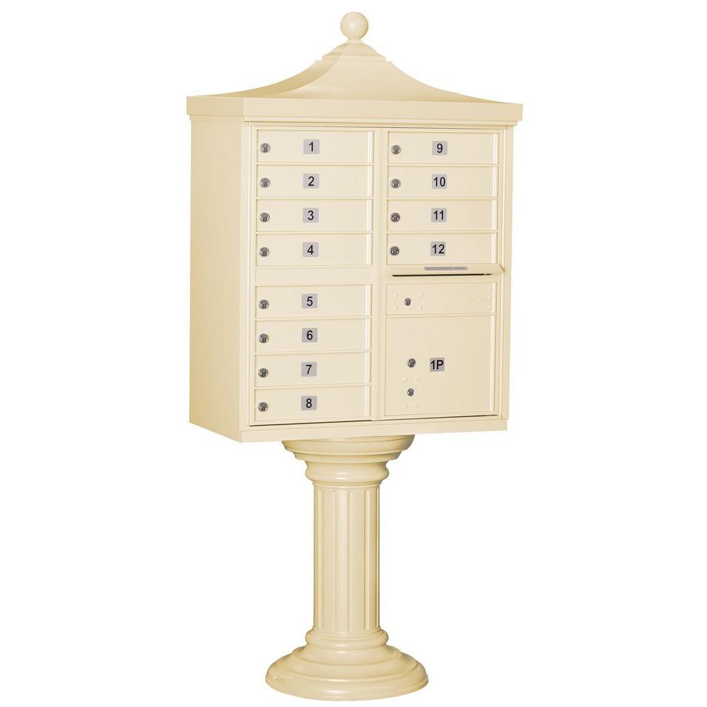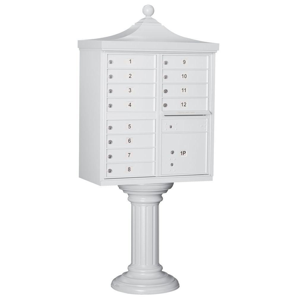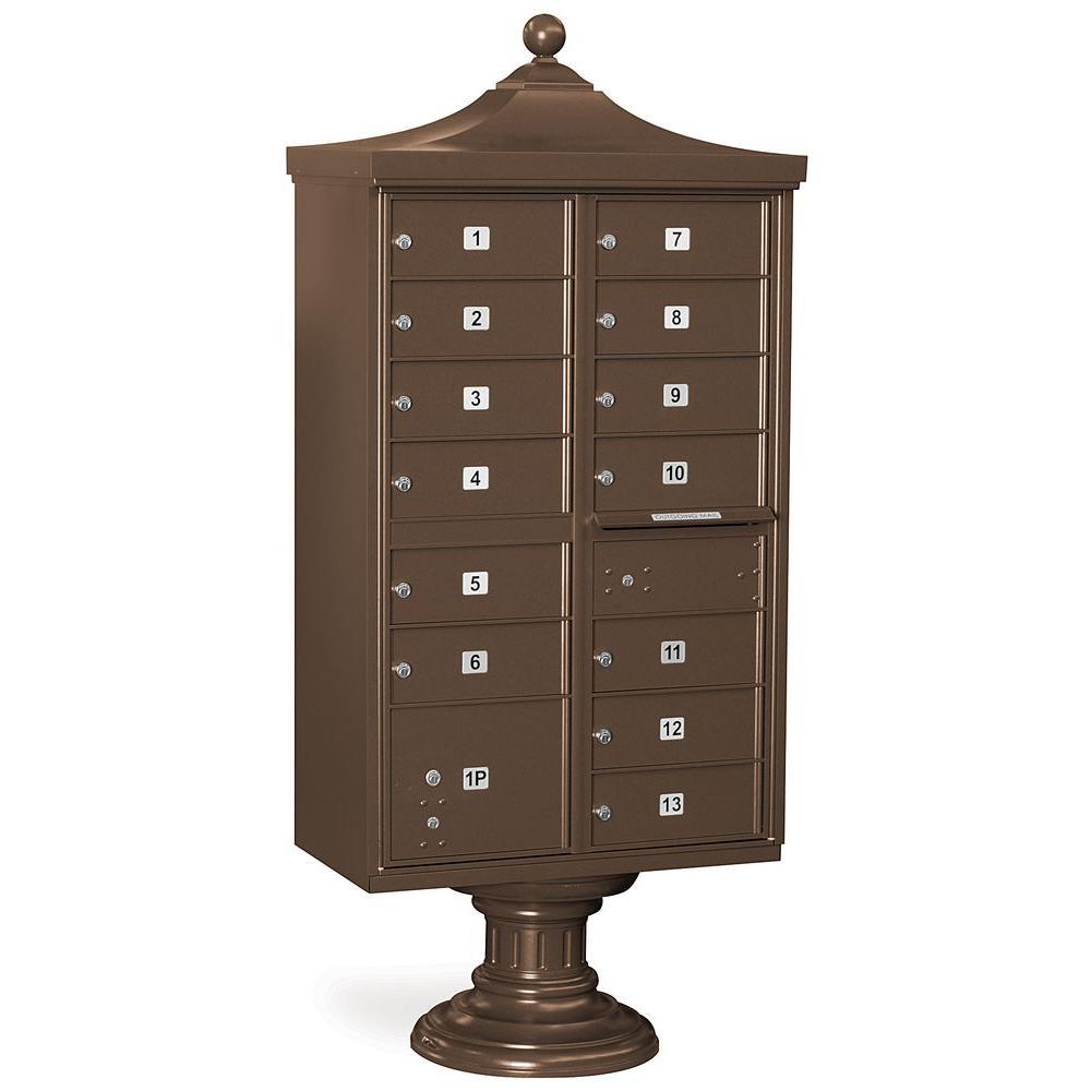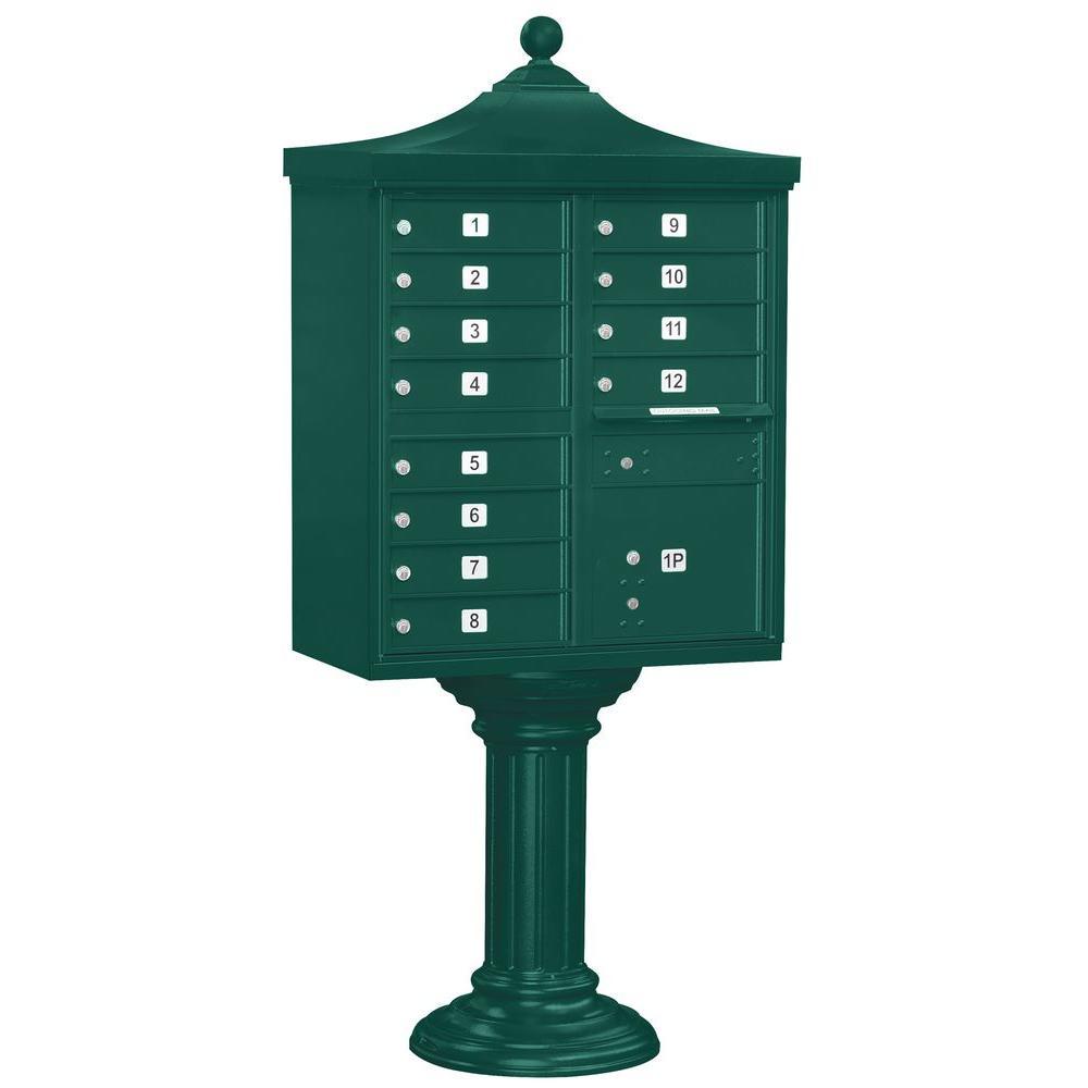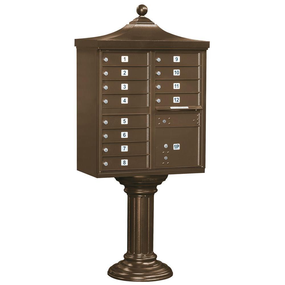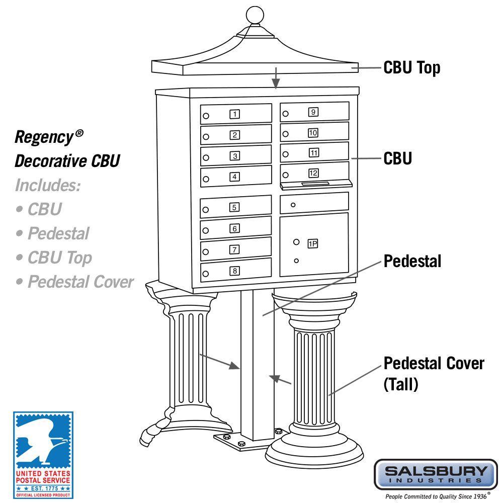 A USPS-approved Regency decorative cluster box unit built from heavy-duty aluminum with stainless steel hardware for long-lasting security. Includes 12 tenant mail doors, 1 integrated parcel locker, an outgoing mail slot, and a matching pedestal with decorative top and cover, finished in durable powder coat.