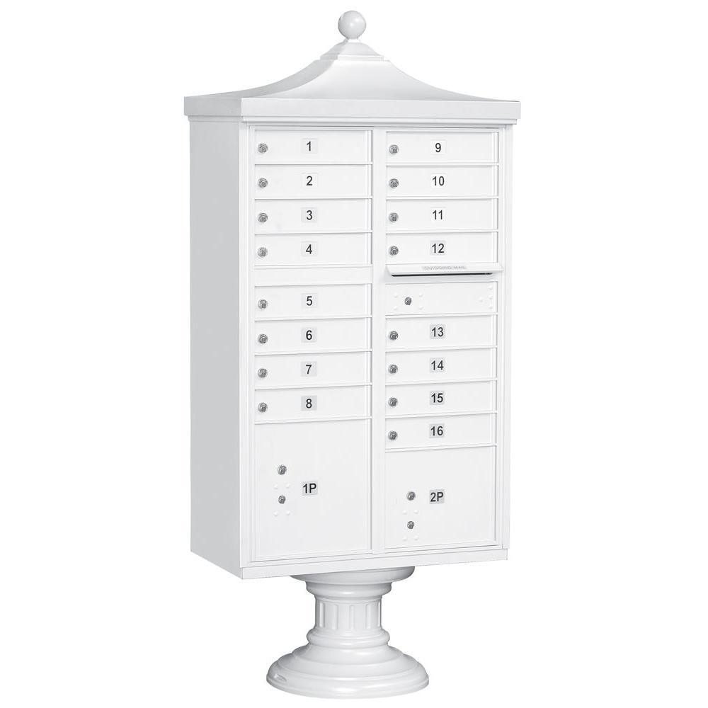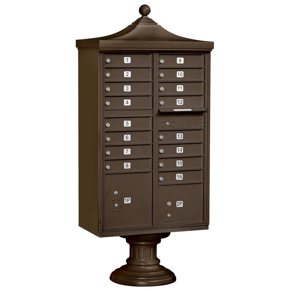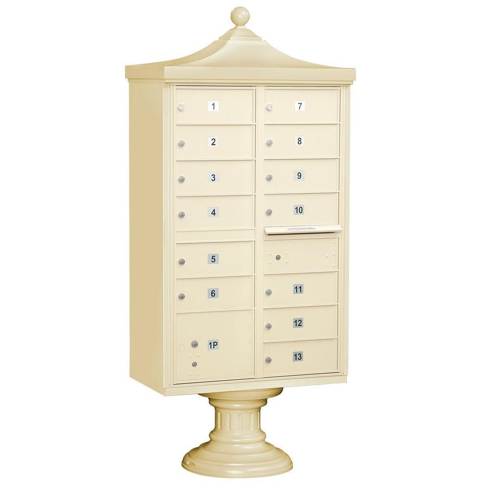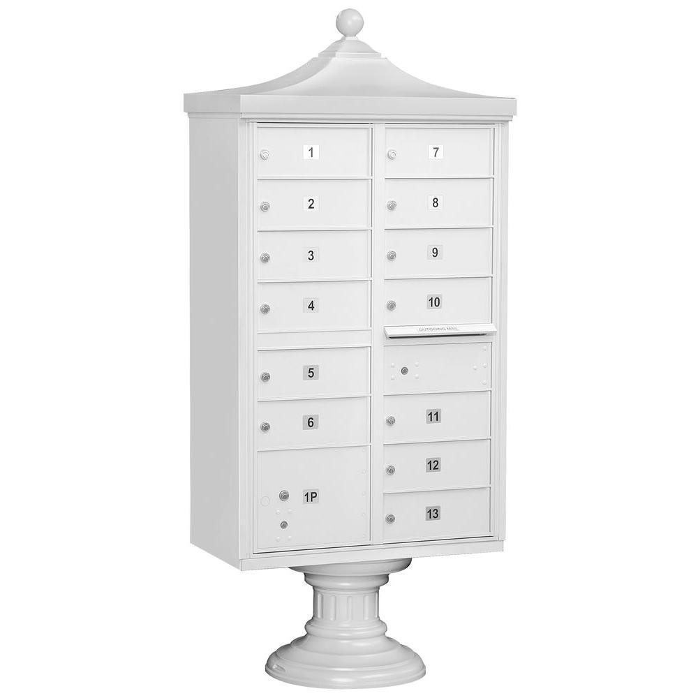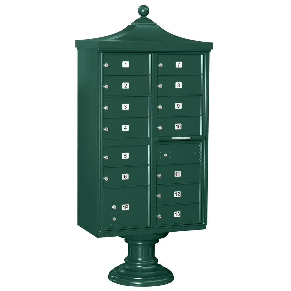 A USPS-approved Regency decorative cluster box unit built from heavy-duty aluminum with stainless steel hardware for long-lasting security. Includes 12 tenant mail doors, 1 integrated parcel locker, an outgoing mail slot, and a matching pedestal with decorative top and cover, finished in durable powder coat.