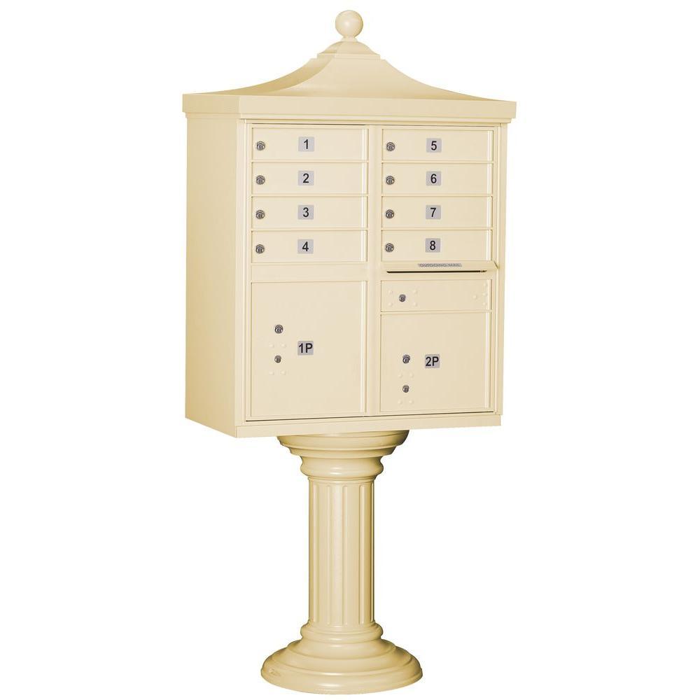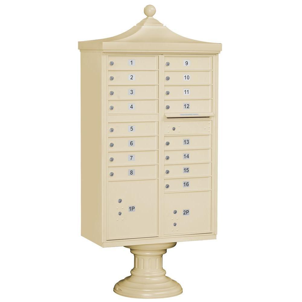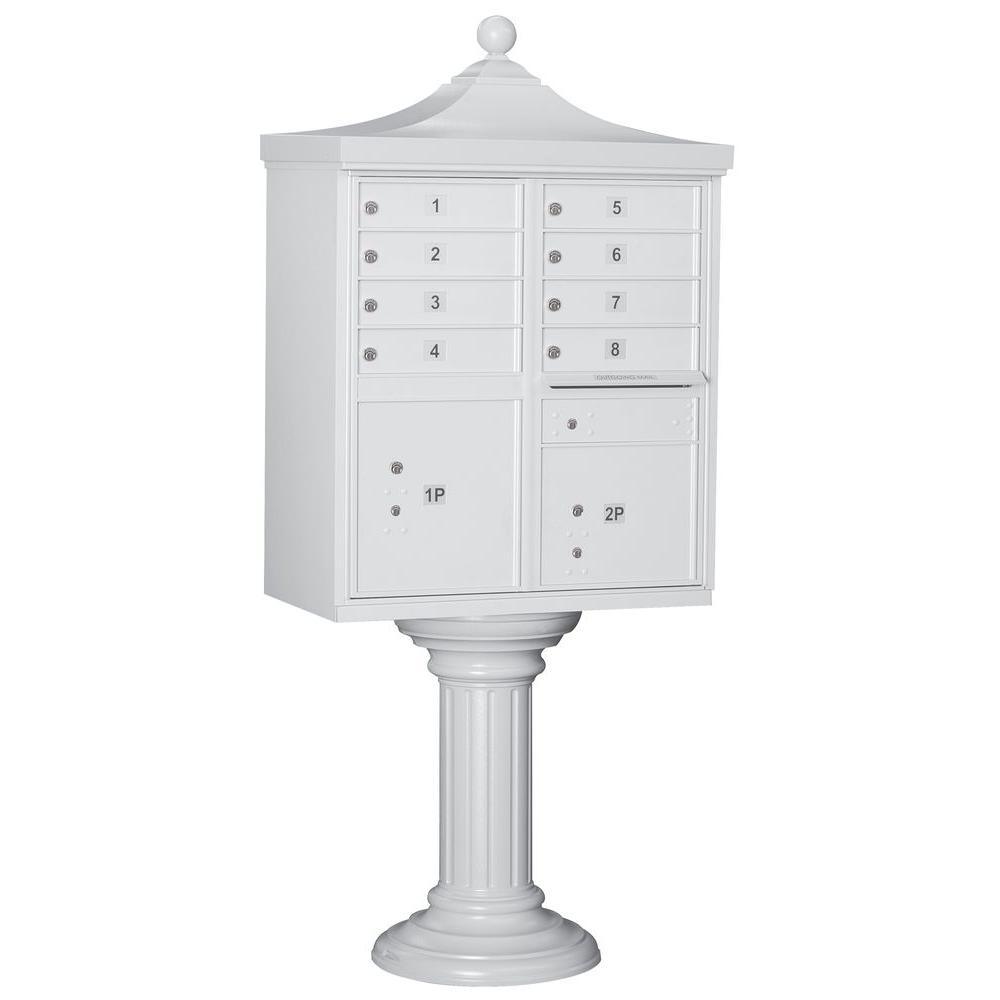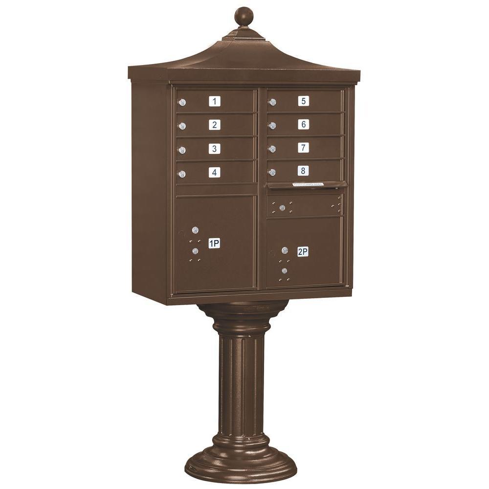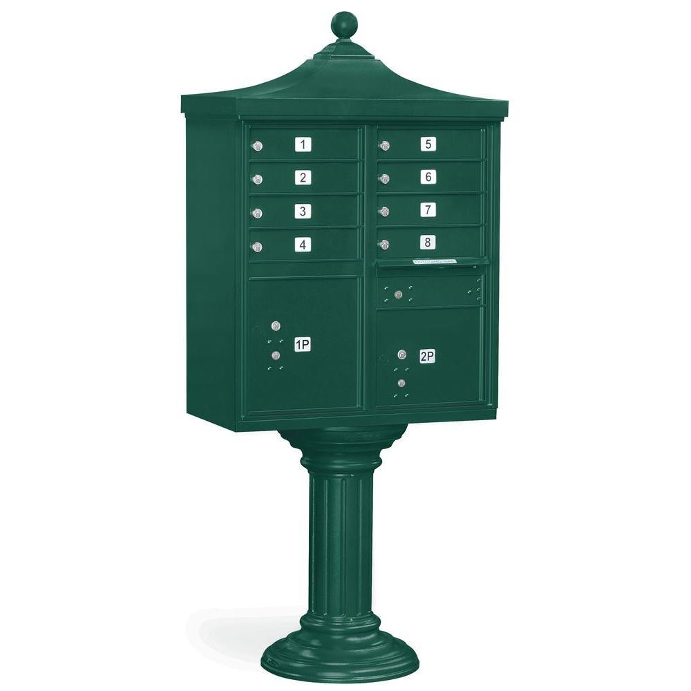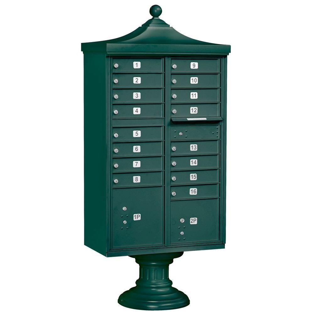 A USPS-approved Regency decorative cluster box unit built from heavy-duty aluminum with stainless steel hardware for long-lasting security. Includes 12 tenant mail doors, 1 integrated parcel locker, an outgoing mail slot, and a matching pedestal with decorative top and cover, finished in durable powder coat.
