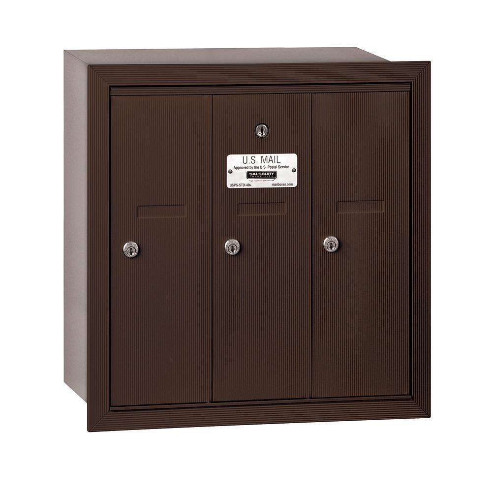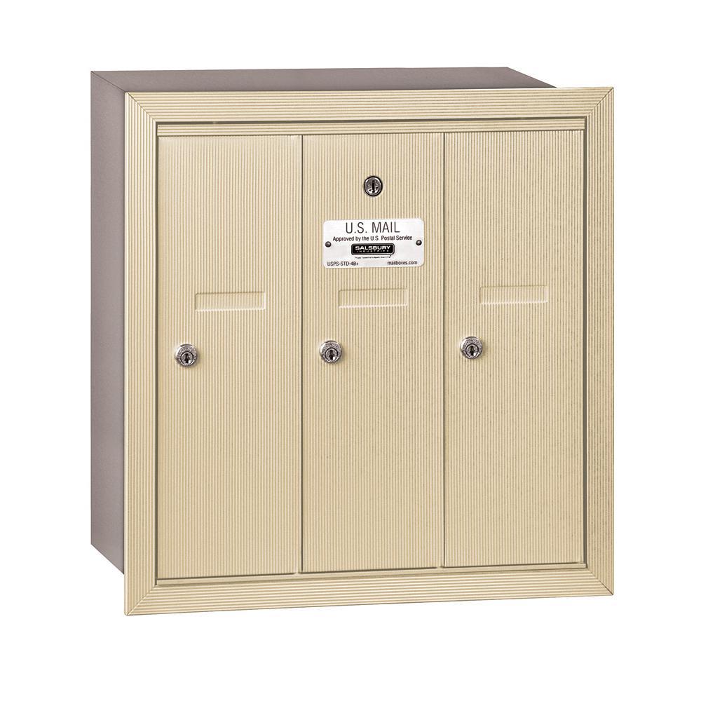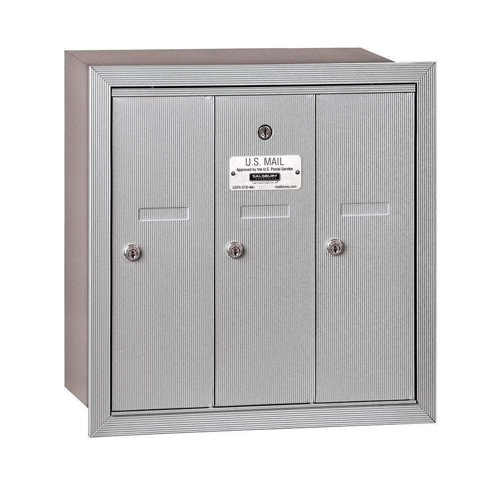 USPS-approved 4B vertical mailbox by Salsbury Industries, designed for recessed wall installation in multi-tenant buildings. Made entirely of aluminum with a durable sandstone powder-coat finish and three tenant compartments secured by cam locks.