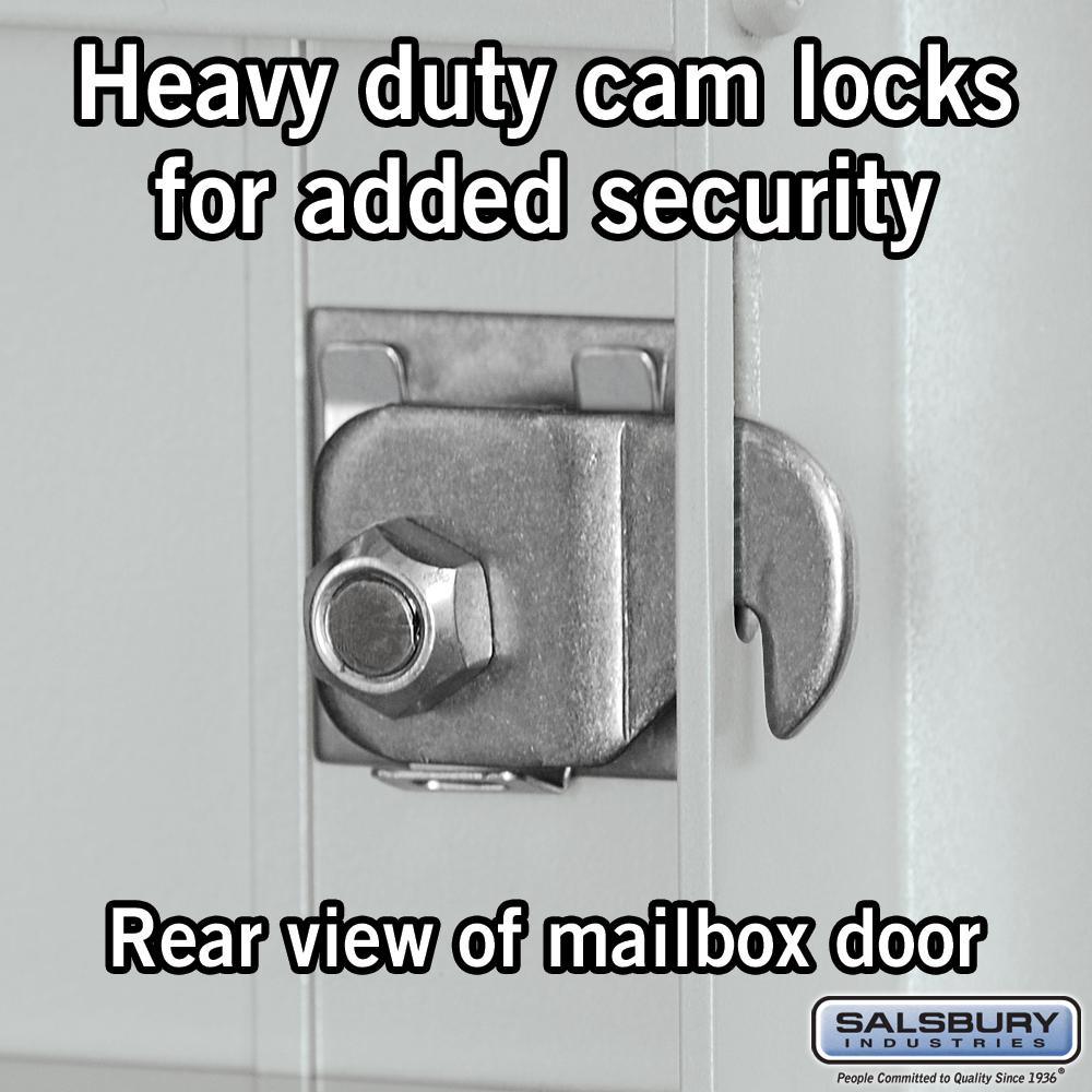 Constructed of heavy-duty aluminum and stainless steel hardware, 3400 series high security 4C pedestal stand alone parcel locker mailboxes are accessed from the front through 1 easy opening door panel. The durable and corrosion resistant units can be used indoors or outdoors and feature a powder coated finish. These 4C pedestal mounted stand alone parcel locker mailboxes are available in sandstone, bronze, green, black, white and gray. 4C stand alone parcel lockers include master commercial locks with 2 keys. The pedestal mounted 4C horizontal stand alone parcel locker mailboxes are ideal when private centralized mail delivery is desired and allow tenants a convenient way to receive packages on site. Ideal for colleges, schools, private postal centers, corporate mail centers, military bases, government agencies and many other applications. For U.S.P.S. delivery of mail, contact your local postmaster for approval. Salsbury Industries is an ISO 9001: 2008 certified company and has excelled in the field of manufacturing since 1936.