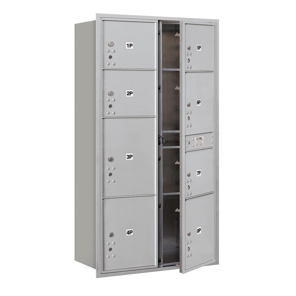 USPS-approved recessed-mount 4C horizontal parcel locker unit with 8 lockers, built from heavy-duty aluminum with stainless steel hardware. Ideal for apartments and commercial buildings, it offers secure front-loading access with durable powder-coated finishes.