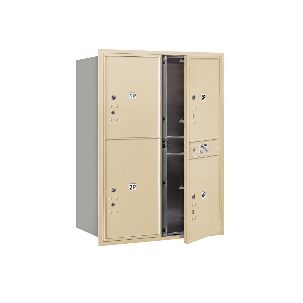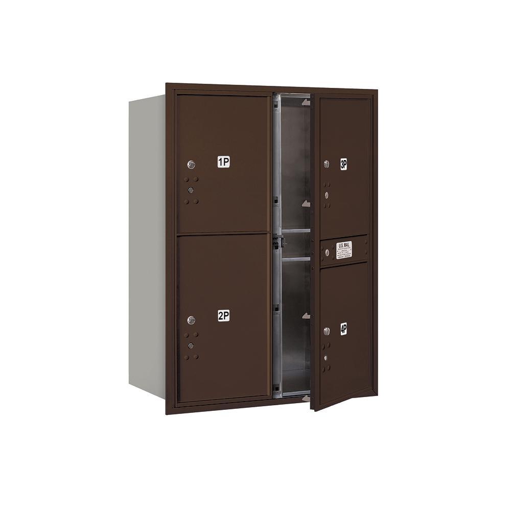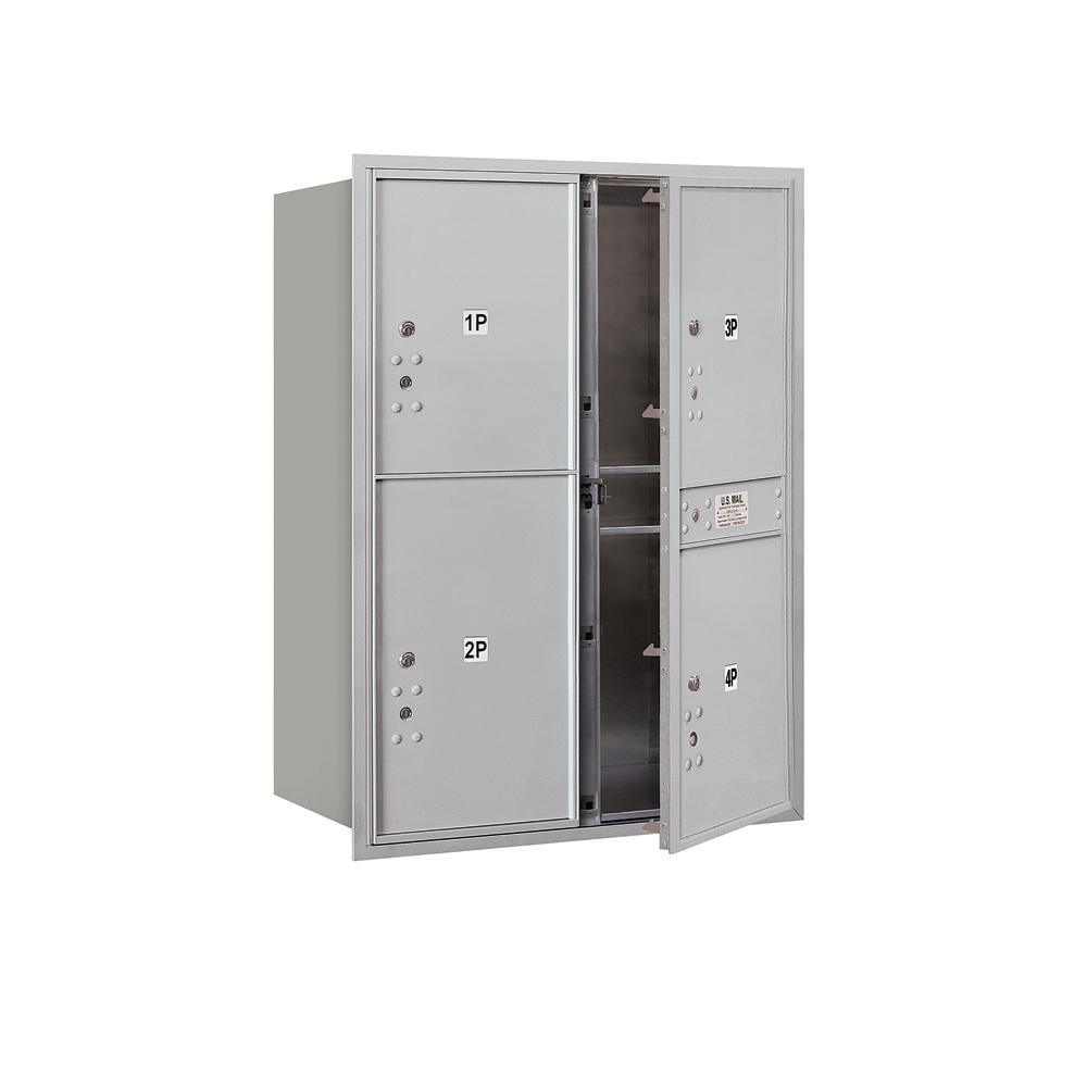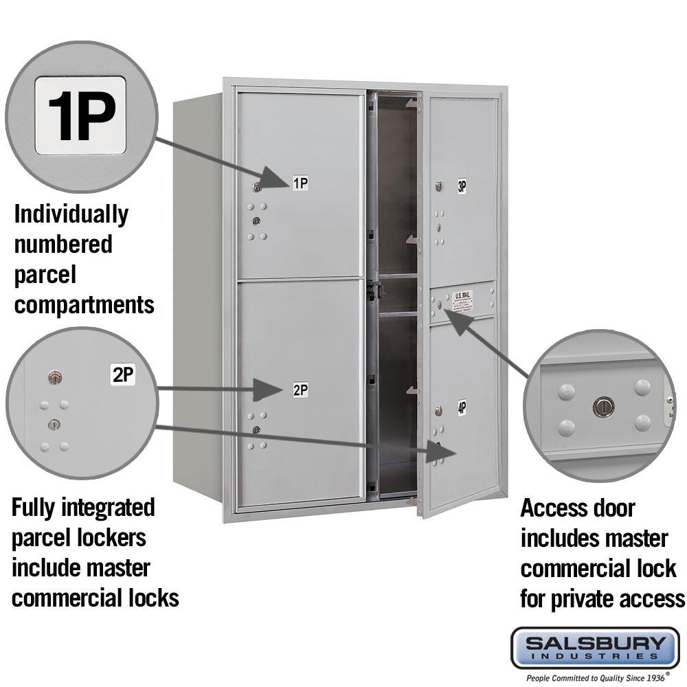 Commercial-grade recessed 4C horizontal mailbox unit engineered for USPS delivery. Constructed from heavy-duty aluminum with stainless hardware, it integrates three parcel lockers and multiple tenant compartments for secure, centralized mail and package distribution.
