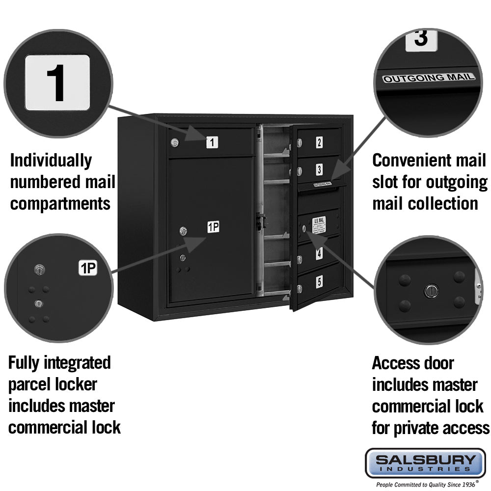This 6-door surface-mounted mailbox with a parcel locker is designed for private access and features durable aluminum construction with a powder-coated black finish. Ideal for indoor or outdoor use, it provides secure mail storage with heavy-duty cam locks and ADA compliance.