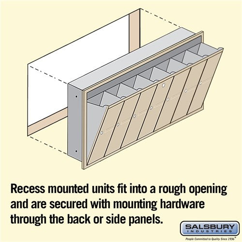 A: The mailbox is recessed-mounted and fits into a rough opening, secured with mounting hardware through the back or side panels.