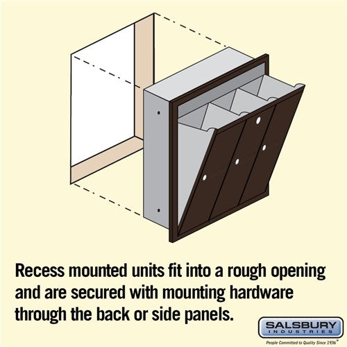 This recessed-mounted vertical mailbox features three compartments and a durable bronze powder-coated finish. Made of aluminum, it meets USPS standards for secure mail delivery and is ideal for apartments or commercial buildings.