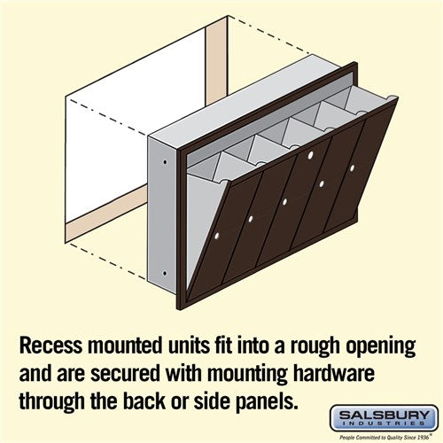A: The mailbox is recessed mounted, fitting into a rough opening and secured with mounting hardware through the back or side panels.