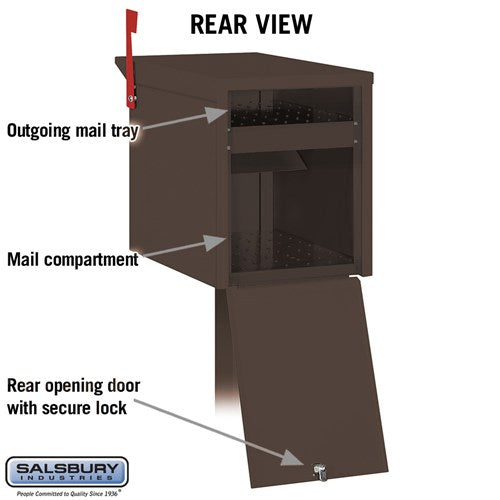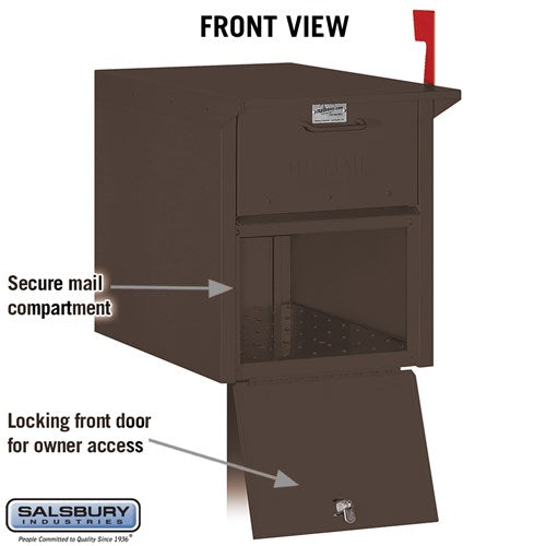 The Bronze Mail Chest is a durable and secure mailbox solution, crafted from aluminum with a powder-coated finish. It features front and rear locking doors, an adjustable signal flag, and is USPS-approved for reliable mail handling.