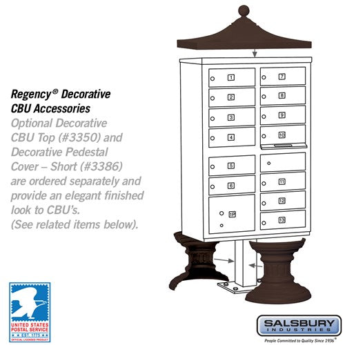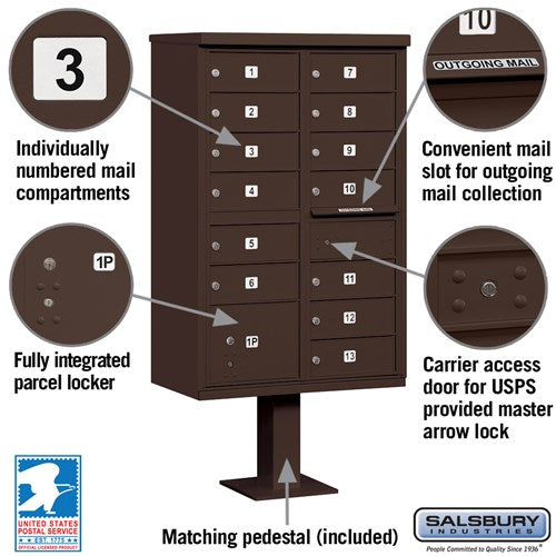 The Cluster Box Unit with 13 Doors and 1 Parcel Locker in Bronze offers secure mail and package storage with USPS access. Constructed from heavy-duty aluminum and stainless steel, it features a durable powder-coated finish and a matching pedestal for stability.