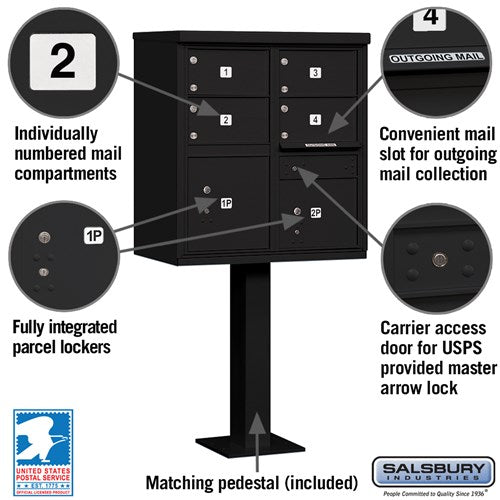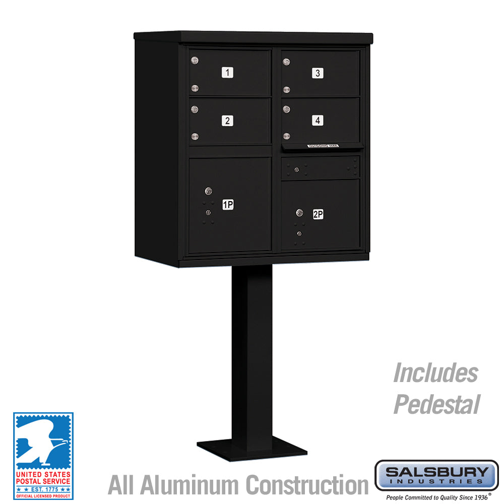 Cluster Box Unit with 4 Doors and 2 Parcel Lockers in Black with USPS Access