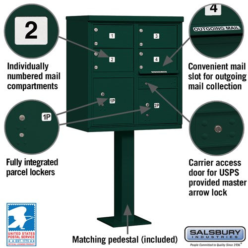 The Salsbury Cluster Box Unit offers a secure and durable solution for mail and package delivery. Constructed with heavy-duty aluminum and stainless steel, it features a green powder-coated finish and includes 4 mail compartments and 2 parcel lockers, making it ideal for residential and commercial use.