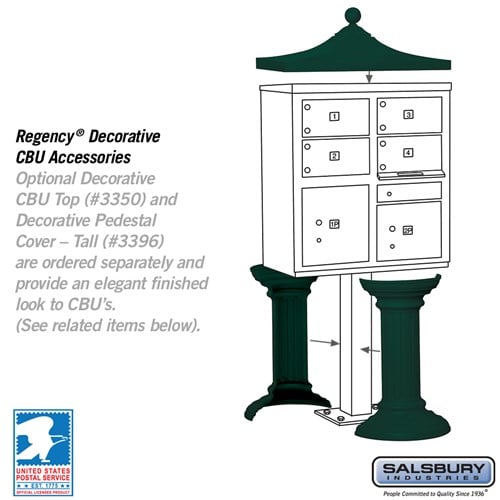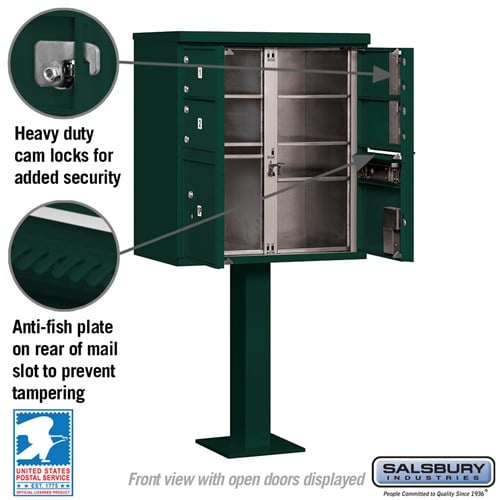 The Salsbury Cluster Box Unit offers a secure and durable solution for mail and package delivery. Constructed with heavy-duty aluminum and stainless steel, it features a green powder-coated finish and includes 4 mail compartments and 2 parcel lockers, making it ideal for residential and commercial use.
