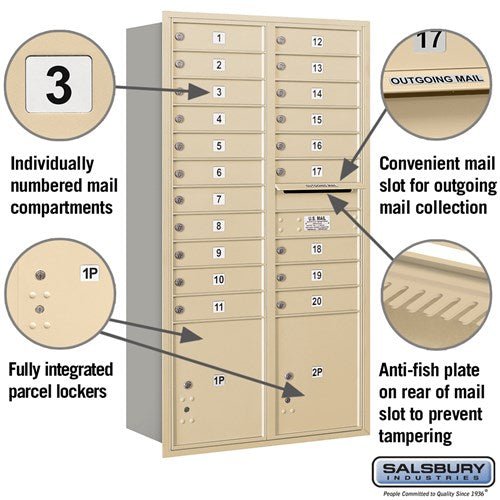Maximum Height Recessed Mounted 4C Horizontal Mailbox with 20 Doors and 2 Parcel Lockers in Sandstone