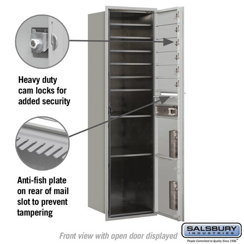 This recessed mounted mailbox offers private access with a durable aluminum construction and a front-loading design. Featuring six mail compartments and two parcel lockers, it ensures secure and organized mail handling.